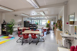 Akustikdecken, Warmwasserheizung, Außenverschattung mittels Wind- und Sonnenwächter, Blitzschutz, behindertengerechter Zugang, Panikbeschläge, Fluchtwegpiktogramme, rauch- und schalldichte Türen, Medienschienen an den Innenwänden, Fenster mit Öffnungsbegrenzer, Linoleumboden, umlaufende Dachentwässerung, Dachattika.