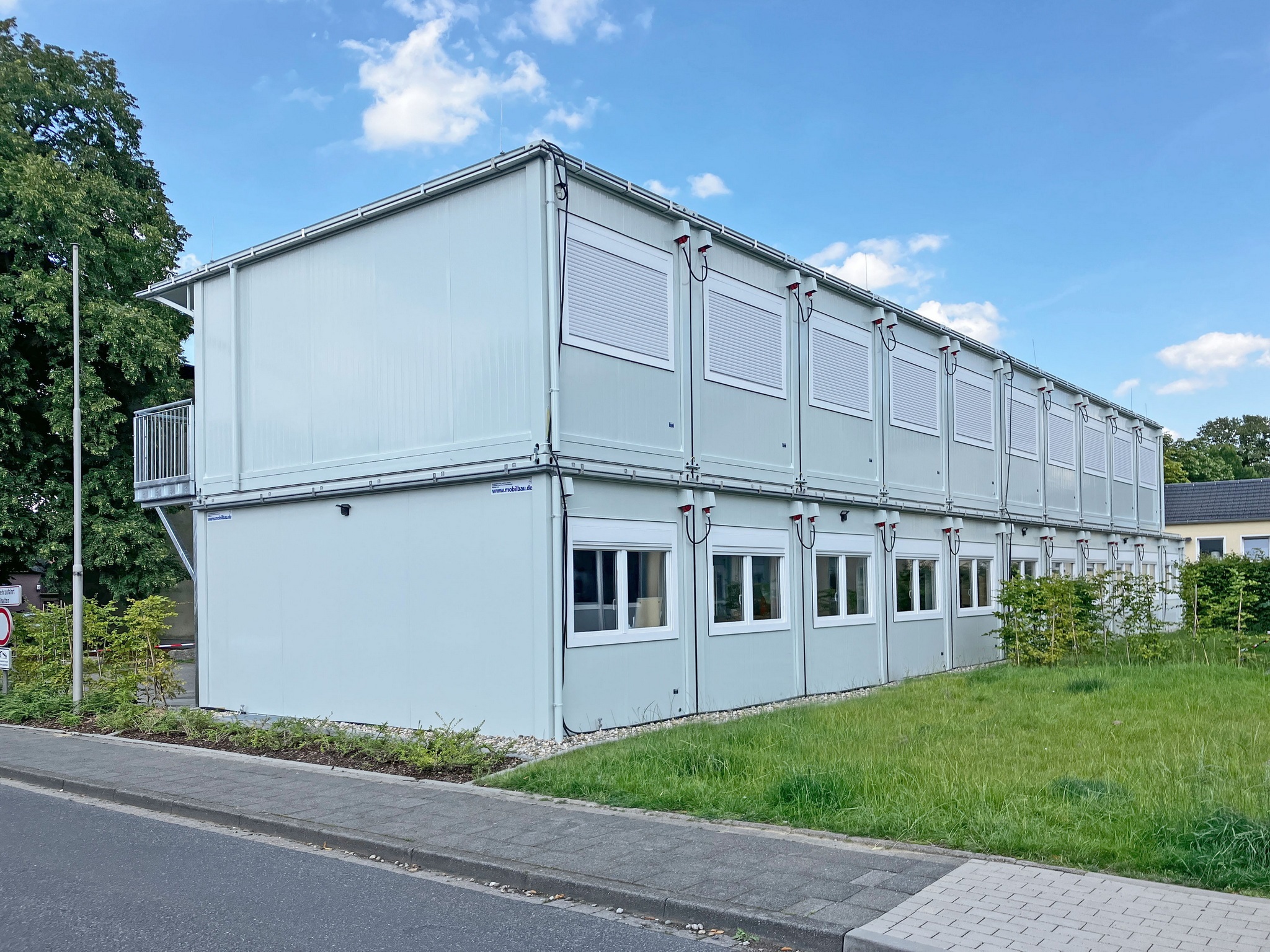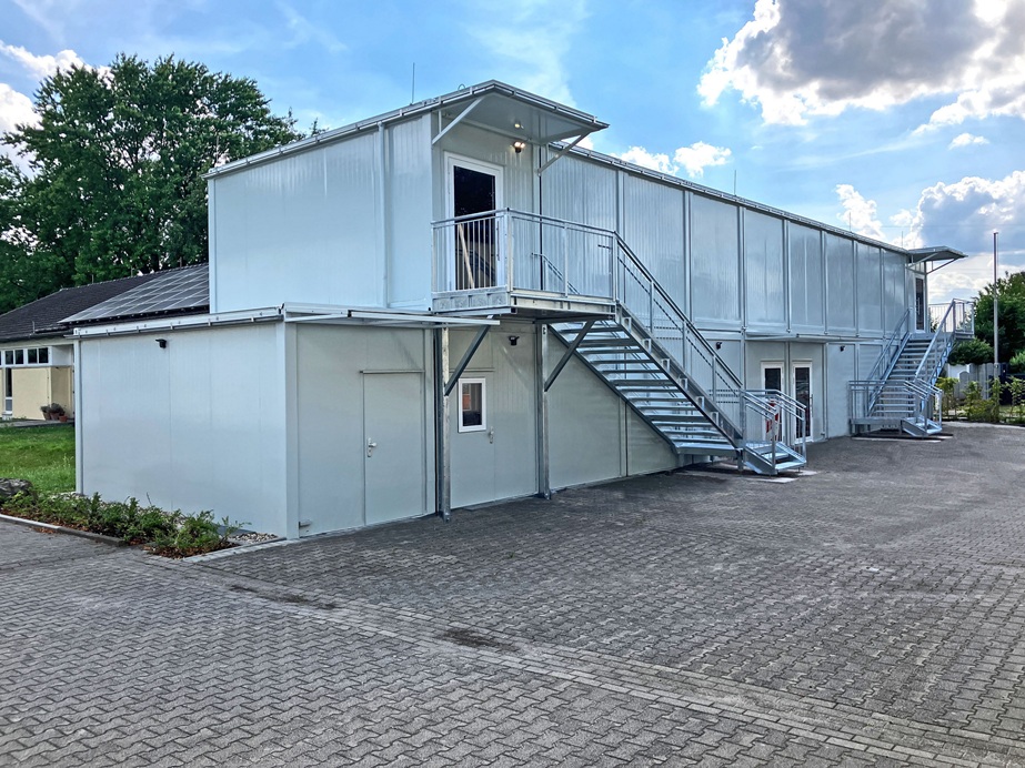 Erdgeschoss 11 Container 6,00x2,43x3,05 m, 5 Vordächer, 2 Haupteingänge, 2 Nebeneingänge Obergeschoss 10 Container 6,00x2,43x3,05 m, 2 Vordächer, 2 Haupteingänge über 2 Fluchttreppen Stahl,