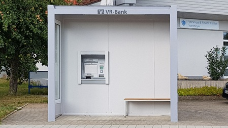 VR Bank Feuchtwangen-Dinkelsbühl, SB-Pavillon mit Kombivariante als Unterstand für Buswartehaus