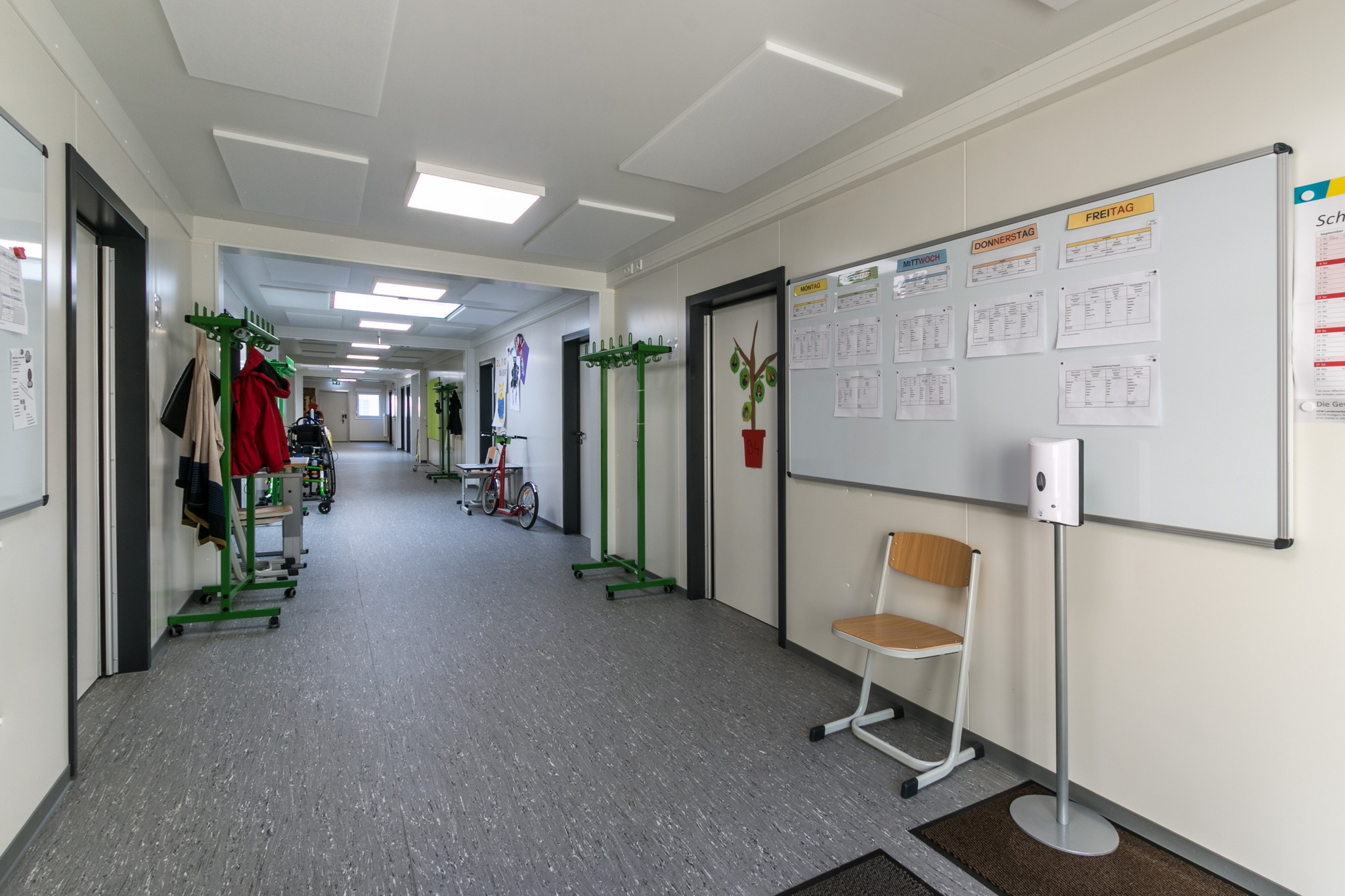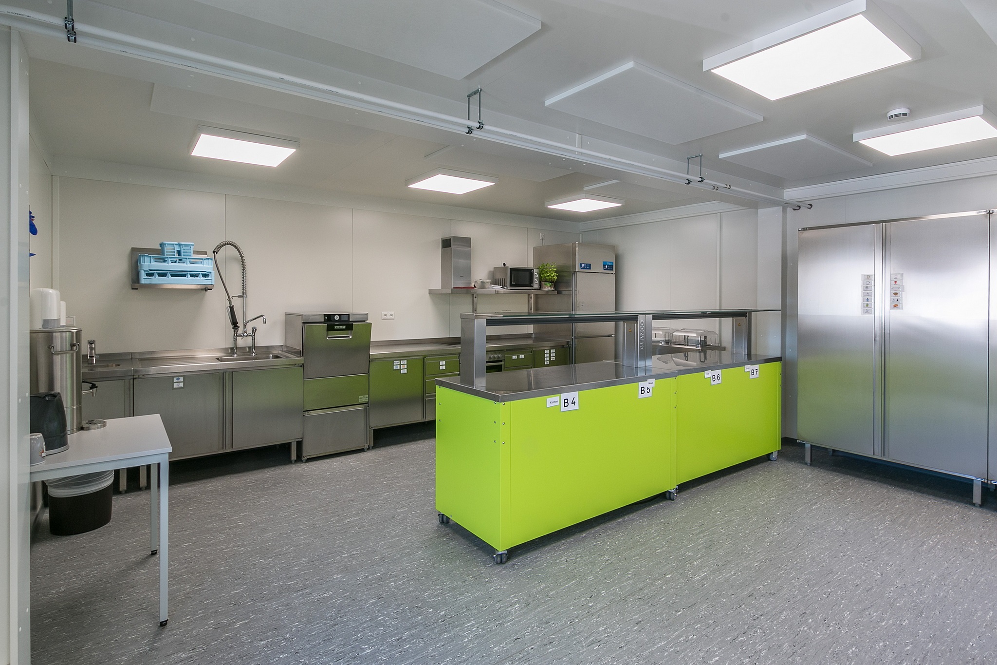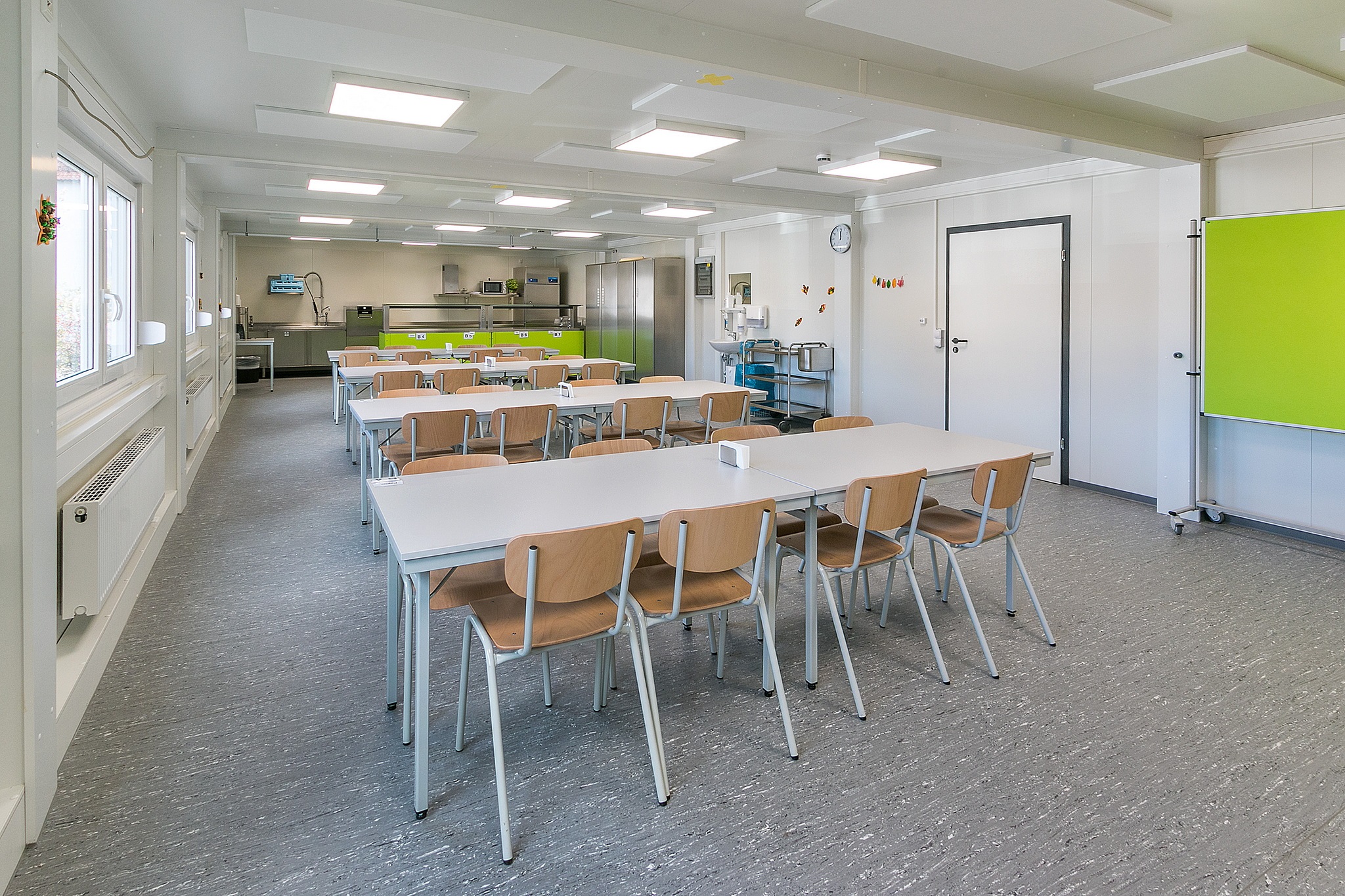 Vordach, Eingangstüre mit Drehtürantrieb, Funkvernetzte Rauchmelder, Akkustikdecke, Linoboden Attika mit Regenfallrohr, Blitzschutz, Klimatisierung, Einbauküchen aus Edelstahl, Technikraum mit Verteilerschrank, Wandler und Zähler, Flattbefestigung.