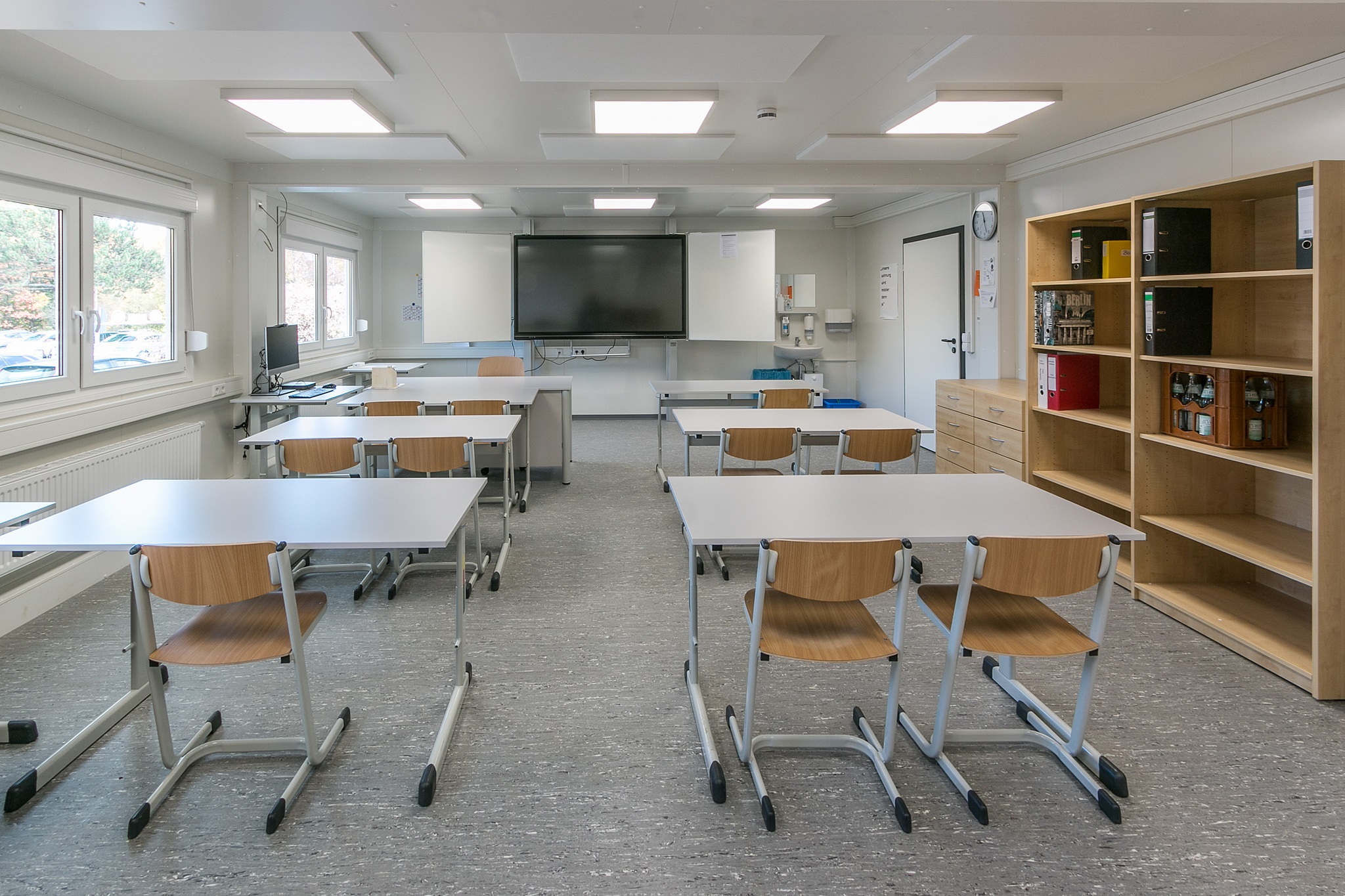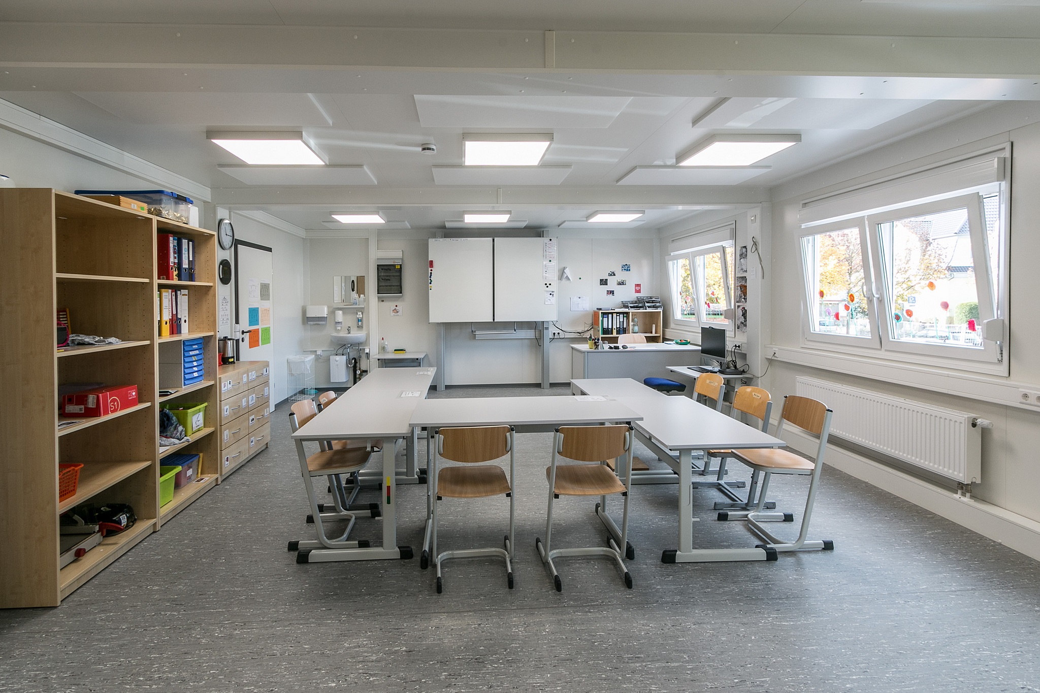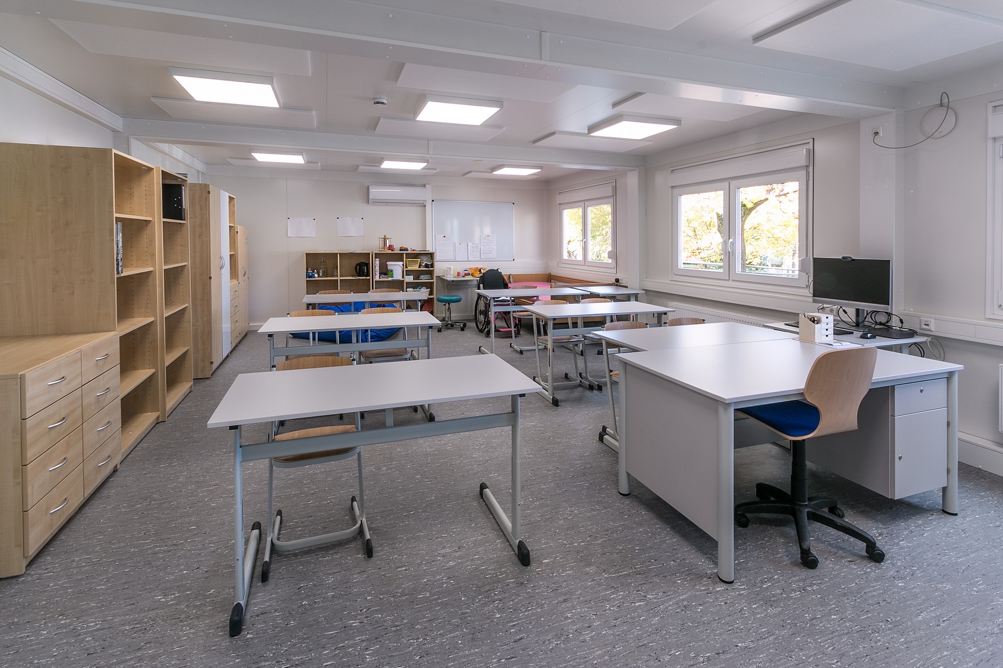 Vordach, Eingangstüre mit Drehtürantrieb, Funkvernetzte Rauchmelder, Akkustikdecke, Linoboden Attika mit Regenfallrohr, Blitzschutz, Klimatisierung, Einbauküchen aus Edelstahl, Technikraum mit Verteilerschrank, Wandler und Zähler, Flattbefestigung.