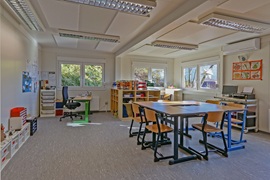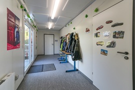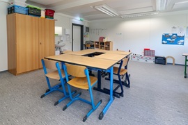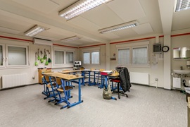 Kunststofffenster mit Isolierverglasung, Rollladen, durchgängiger Linoleum-Bodenbelag, Akustikplatten, Elektroheizung, Klima - Splitgeräte, Sanitäranlage, WC Jungen, Mädchen, Garderobe, umlaufende Entwässerung mittels Fallrohren und Dachattika Verkleidung, EneV 2016, Isolierung