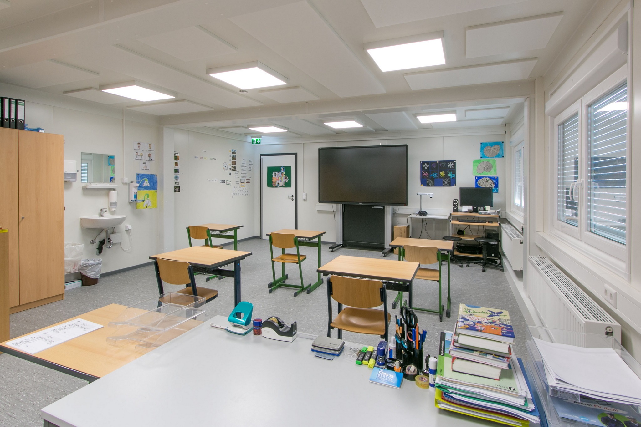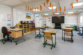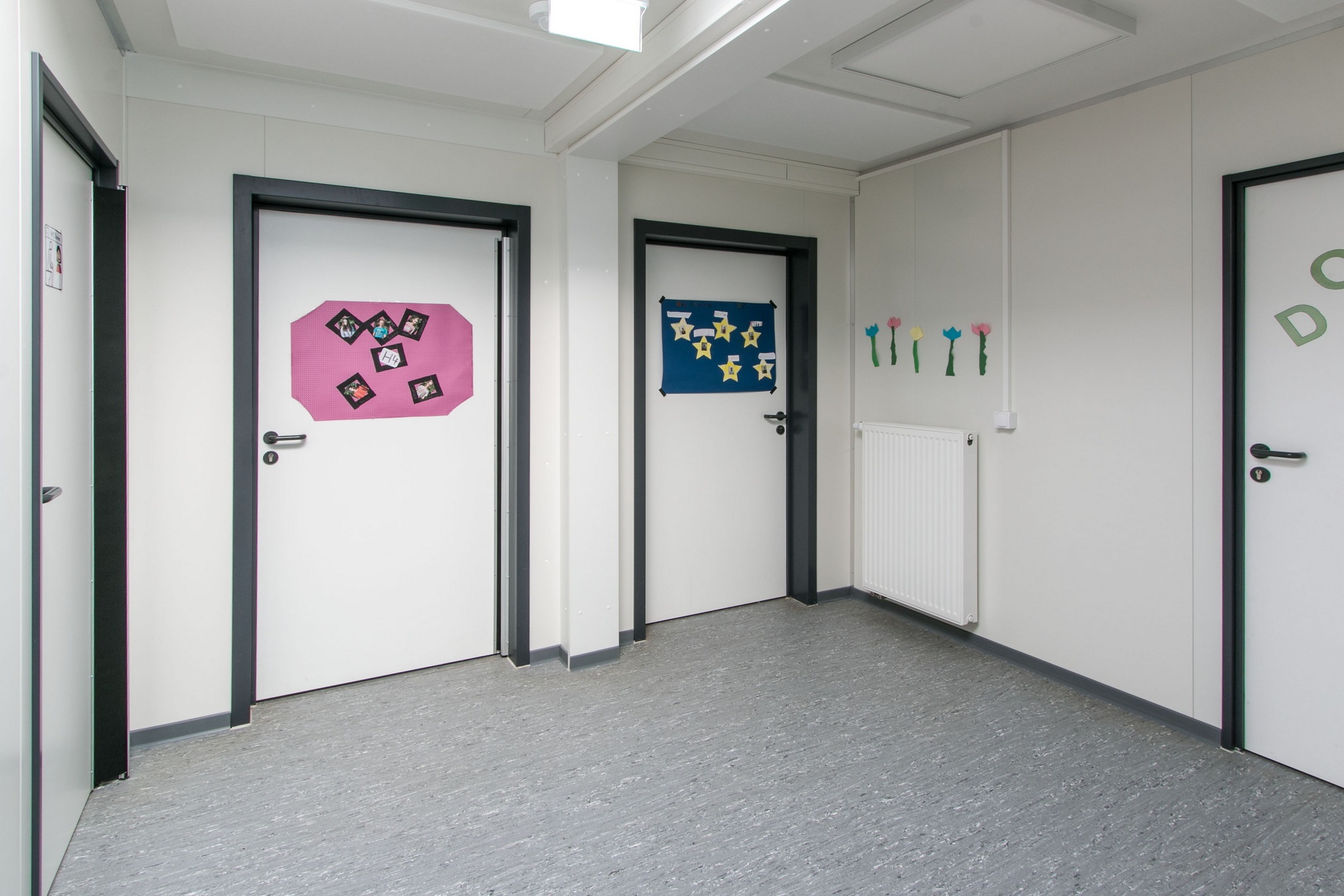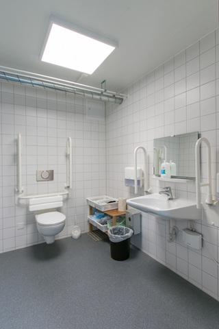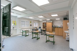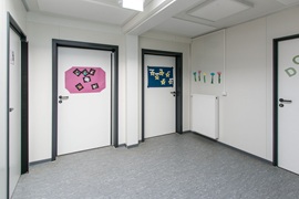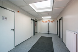 Flur mit Lichtkuppeln, Technikraum, Behinderten-WC, Akustikplatten, funkvernetzte Rauchmelder, behindertengerechte Ausführung, Dämmung in EneV-Ausführung, Warmwasserheizung, Entwässerung mittels Regenrohre und Attika, WC´s gefliest, Automatiktüre mit Sensor, durchgängig verlegter Linoleumboden.