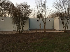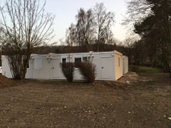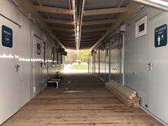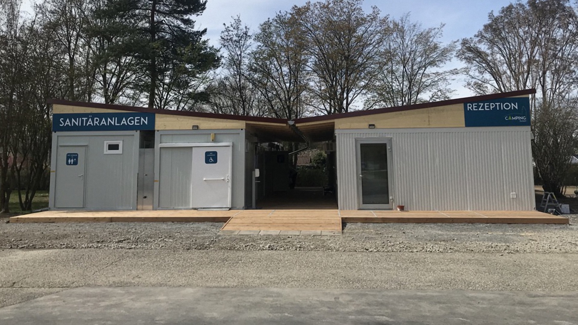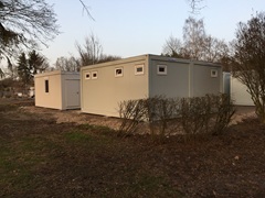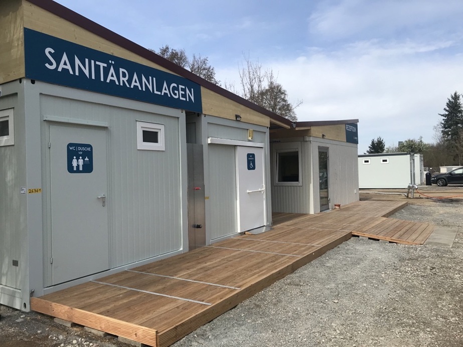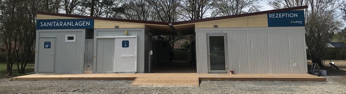 eingeschossig als Sanitäranlage, bestehend aus Wasch-, Dusch- und WC Räumen, Damen / Herren getrennt. Behinderten WC. Rutschfestem PVC-Boden, E-Installation, Beleuchtung, E-Heizung.