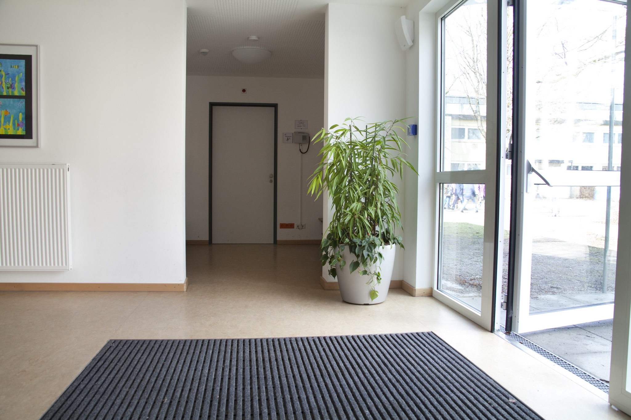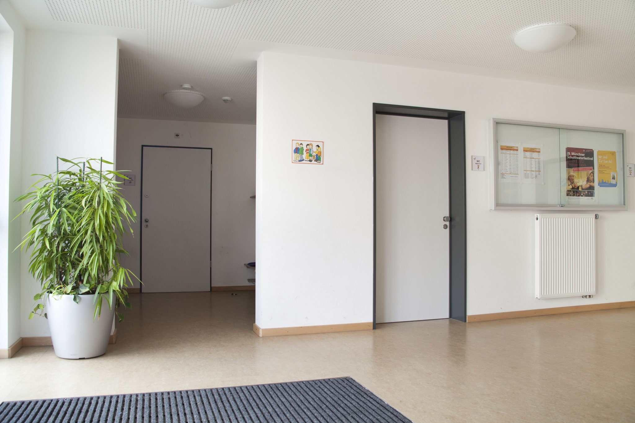 Fensterelemente in Kunststoff mit elektrischen Rollladen, Eingangstürelement in Alu-Bauweise, großformatig. Abgehängte Lochraster-Gipsdecke, Linoleumboden, Nassräume gefliest, Einbaugarderoben, Sanitärinstallation, Heizung für Anschluss an vorhandenes Heiznetz der Schulanlage, Elektroinstallation mit Beleuchtung, Brandmeldeanlage