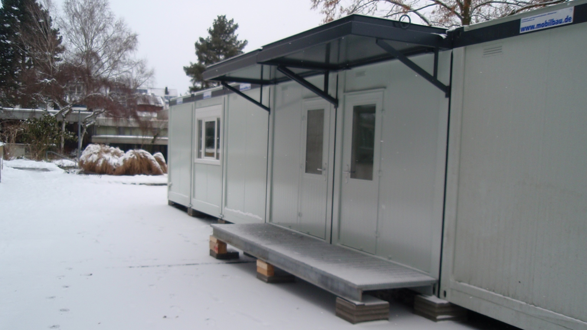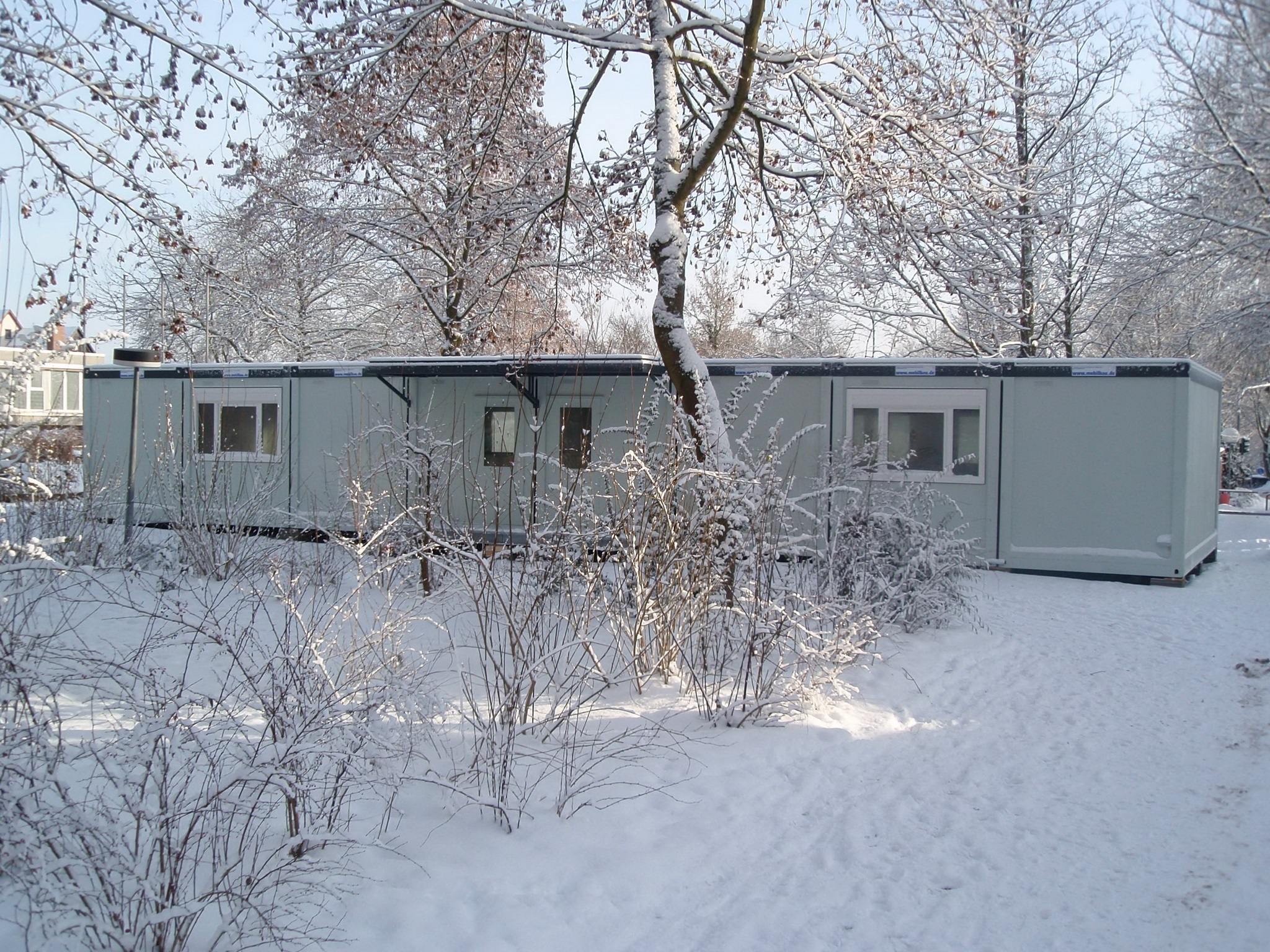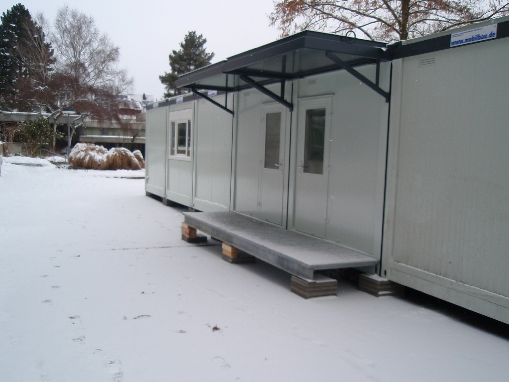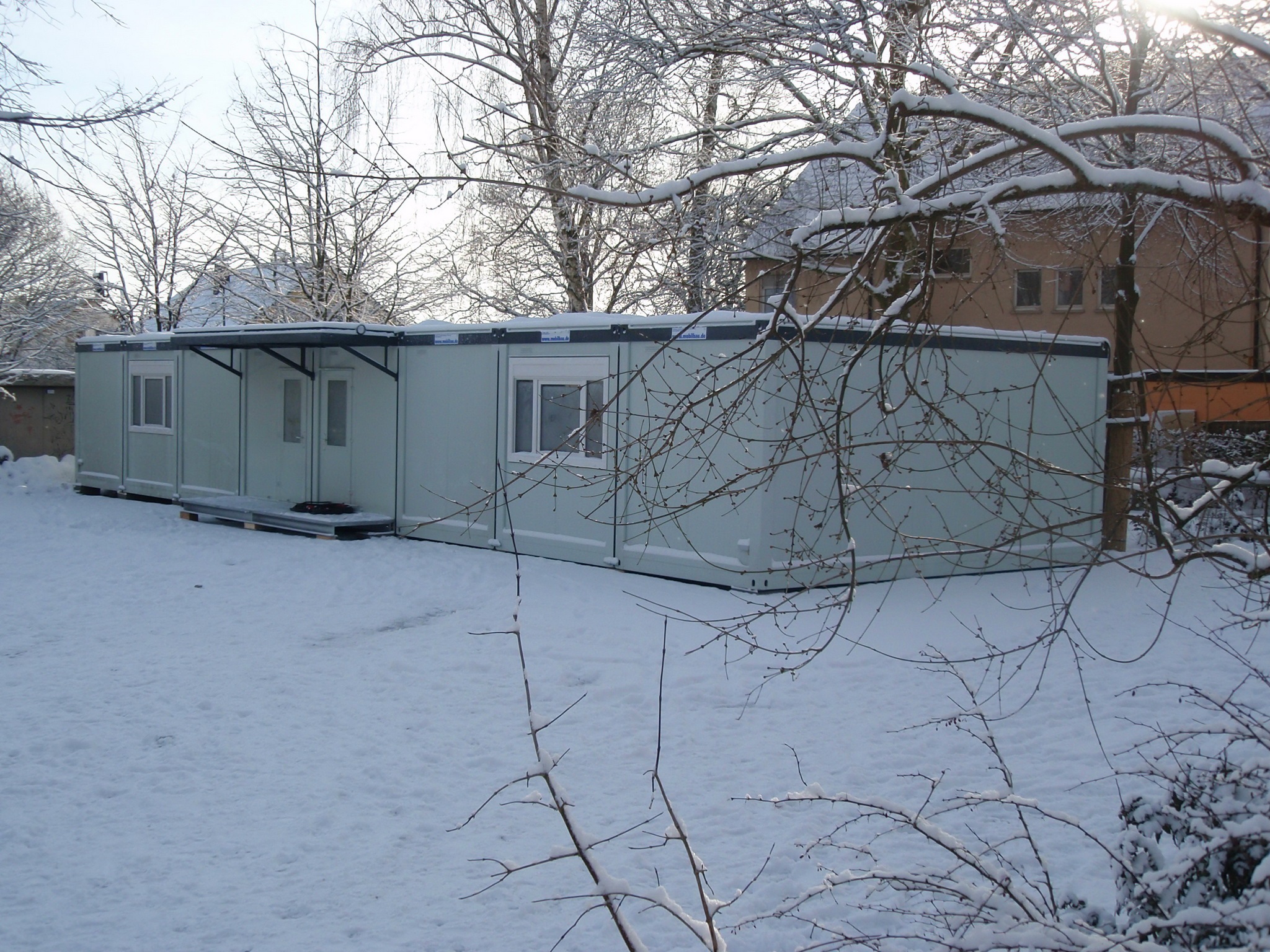 Containerbauwerk, 24 Container à 6,00 x 2,40 m, 6 Klassenräume, Fluchtwegefenster, Vordächer, Außentüren mit Panikbeschlag
