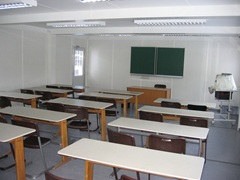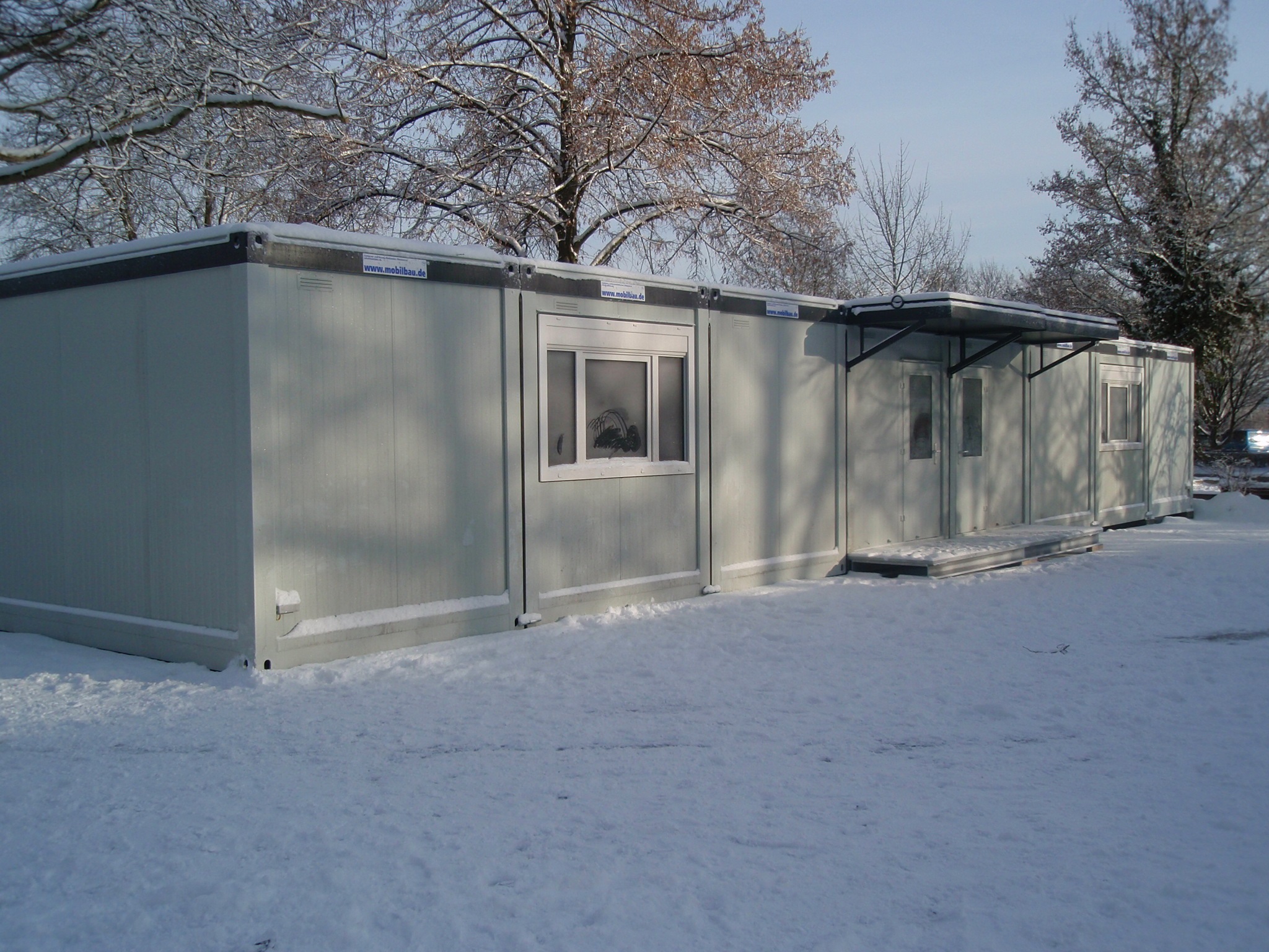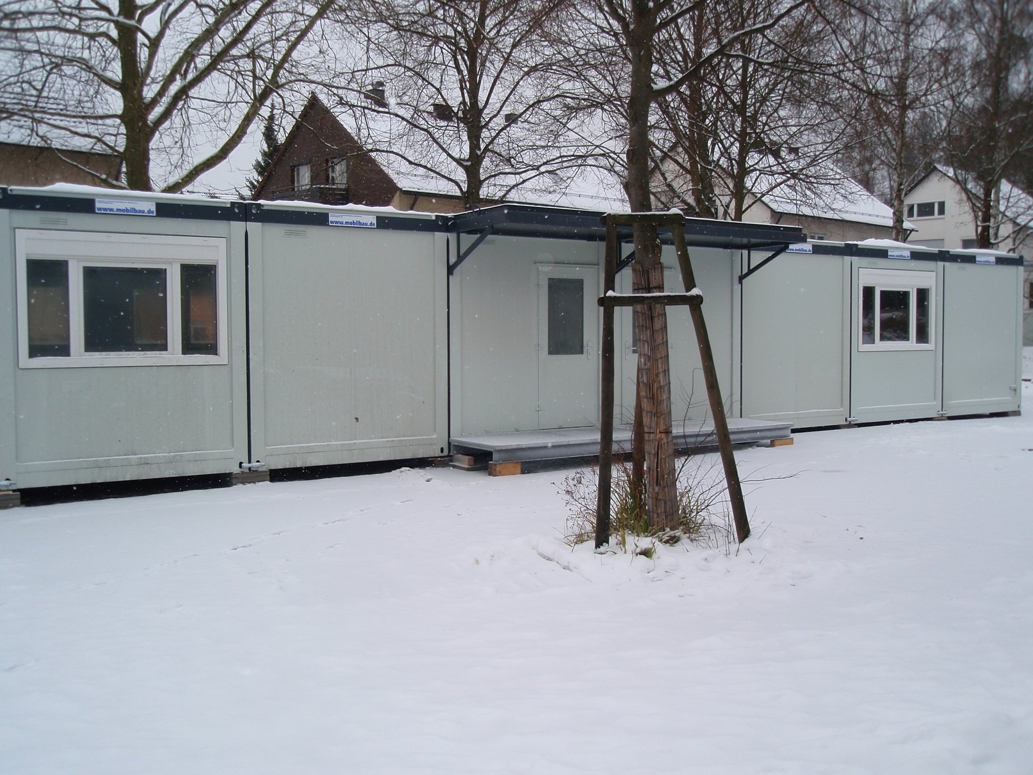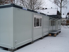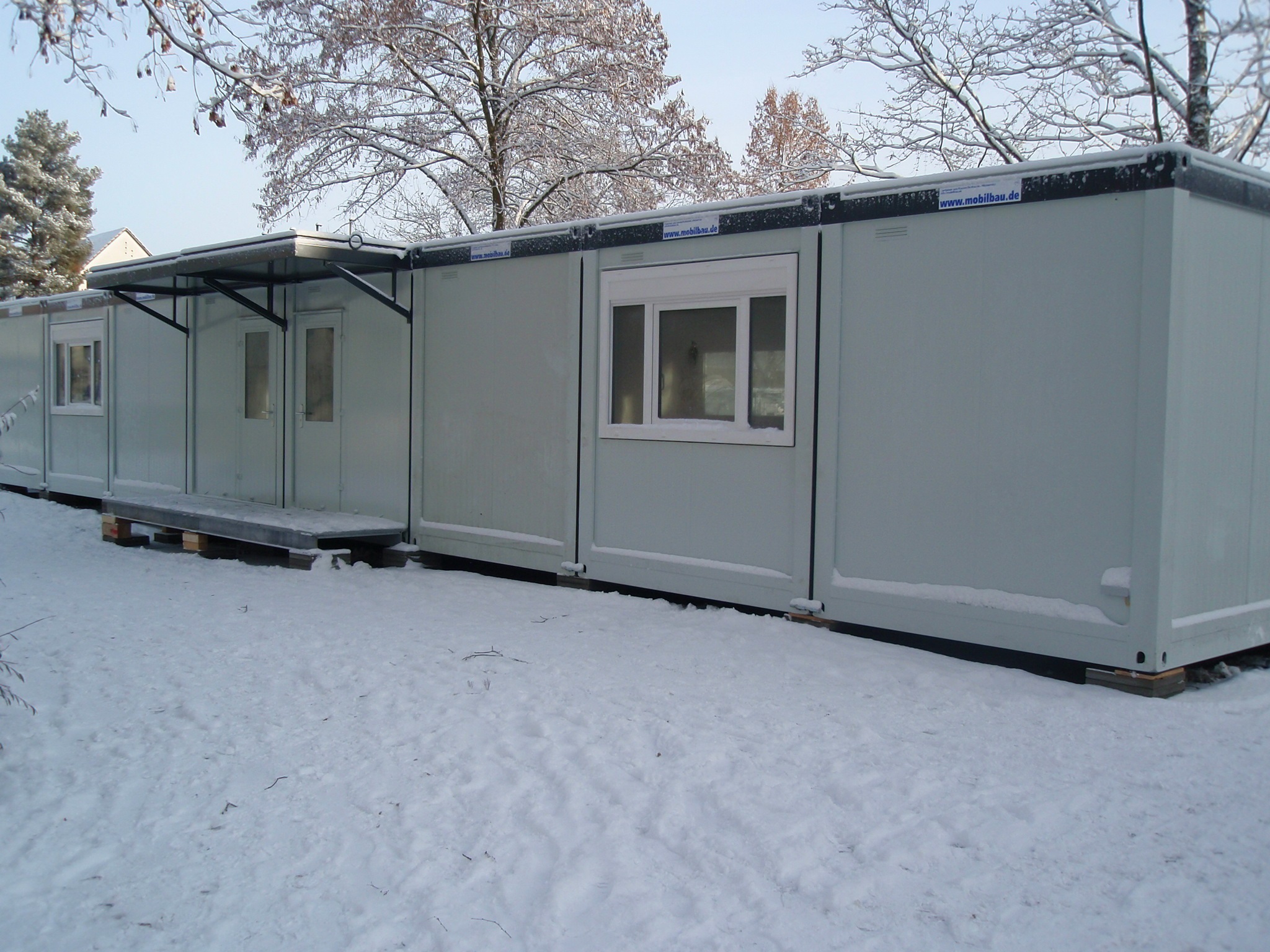 Containerbauwerk, 24 Container à 6,00 x 2,40 m, 6 Klassenräume, Fluchtwegefenster, Vordächer, Außentüren mit Panikbeschlag