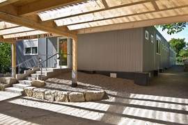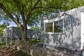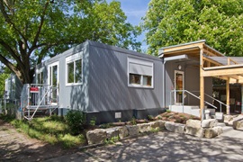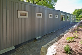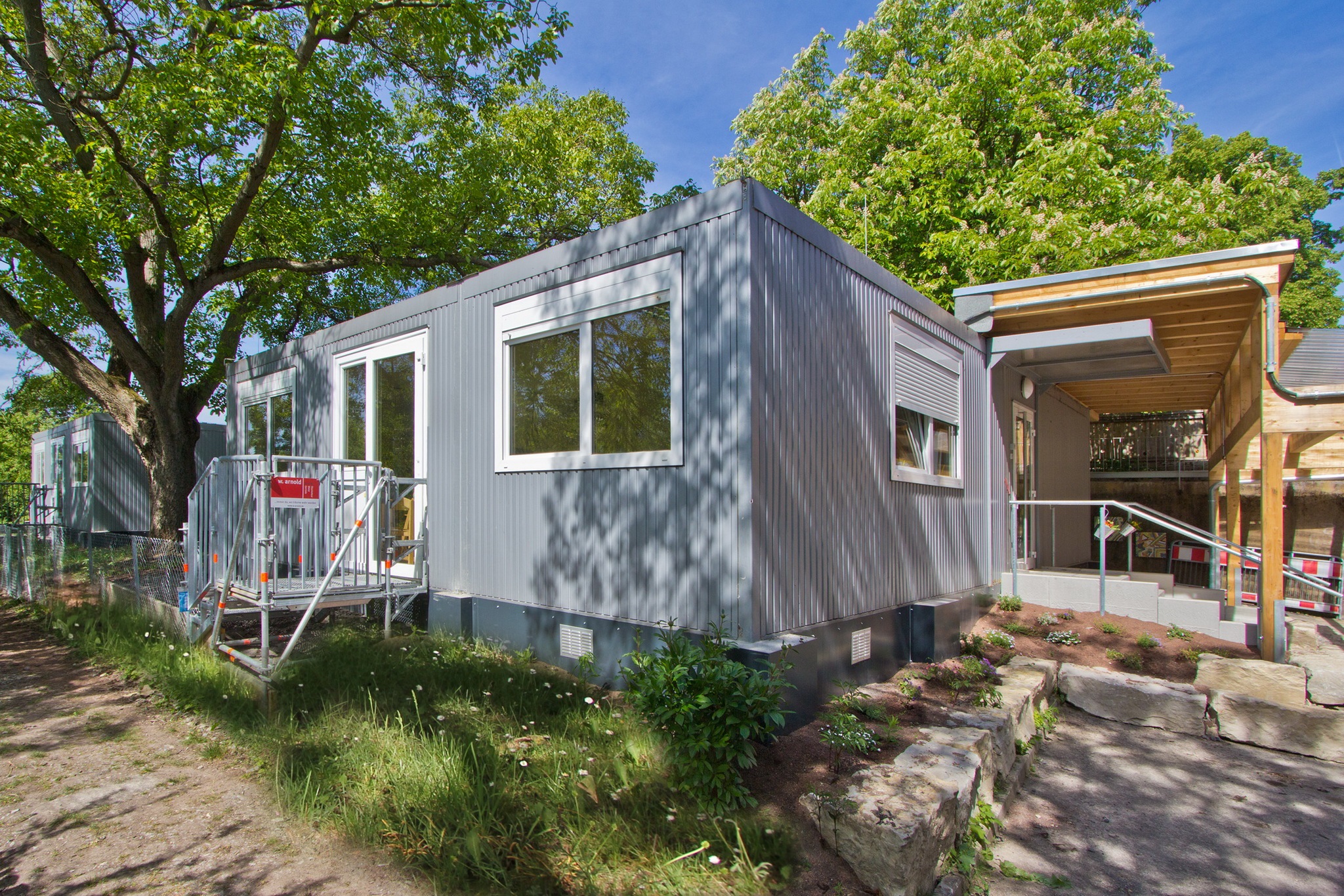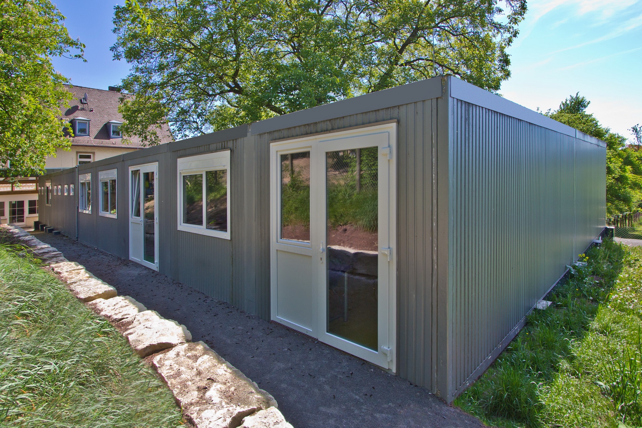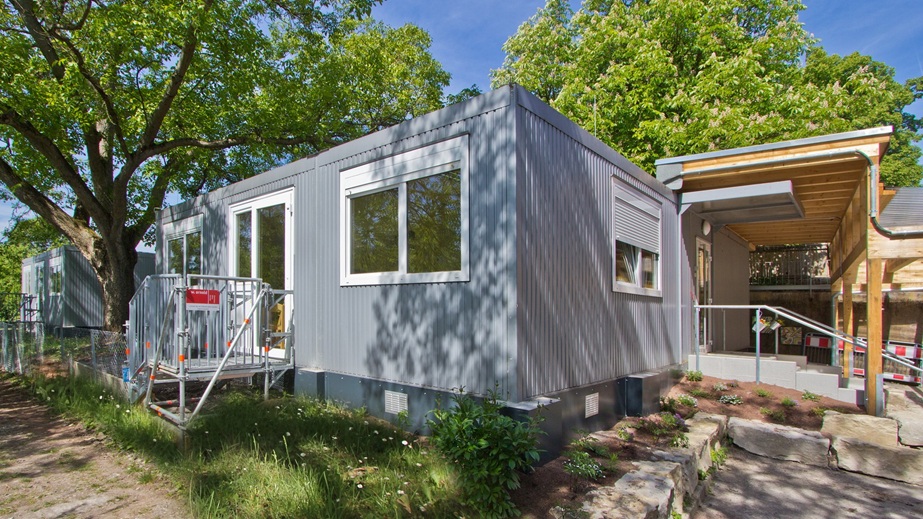 Fertigbauweise bestehend aus 15 Container-Modulen 6,00 x 3,00 m, lichte Raumhöhe 2,50 m, Wärmedämmung nach EnEV