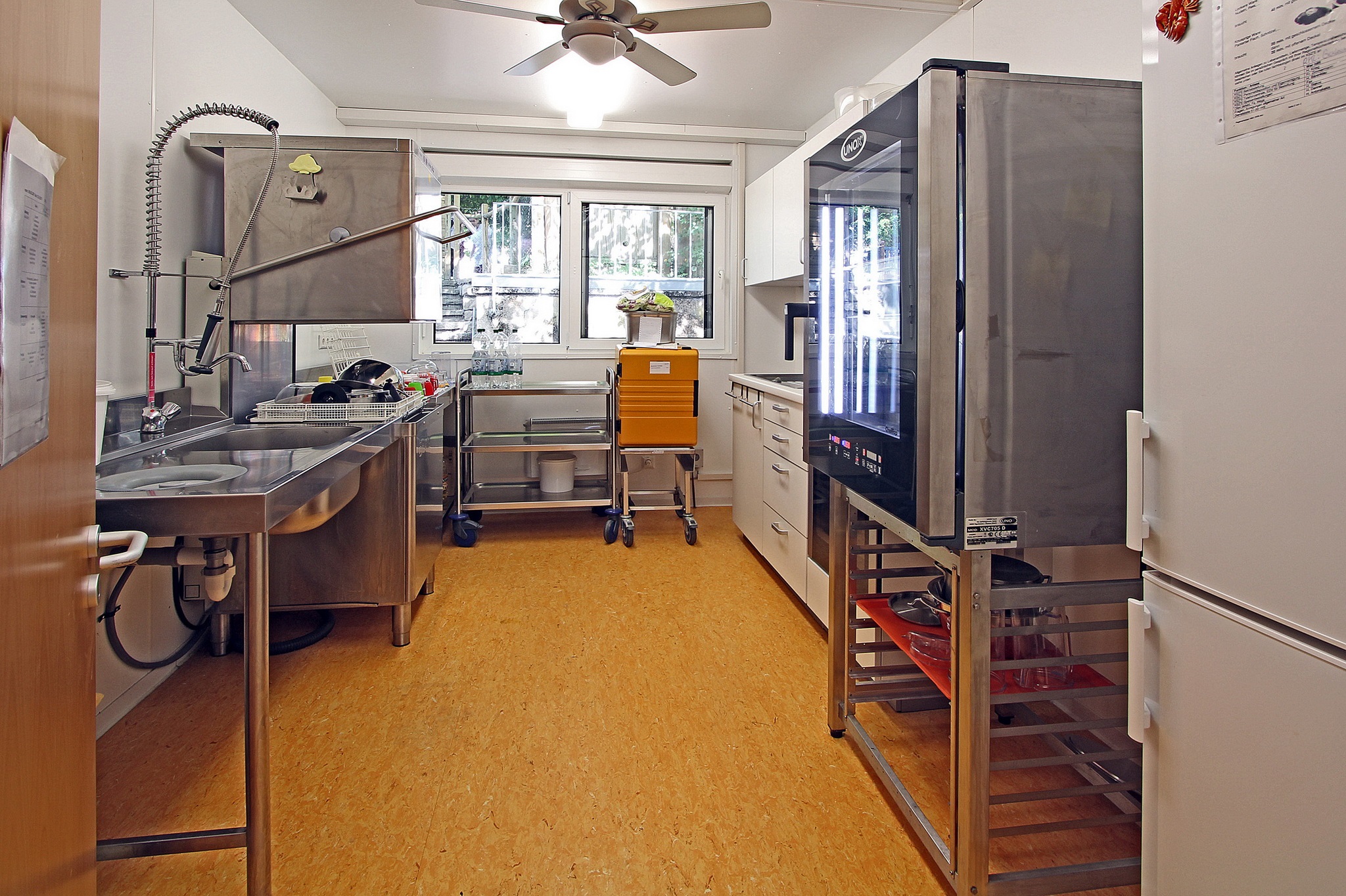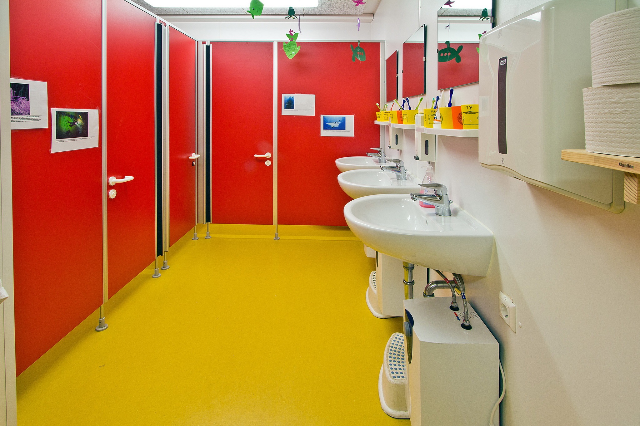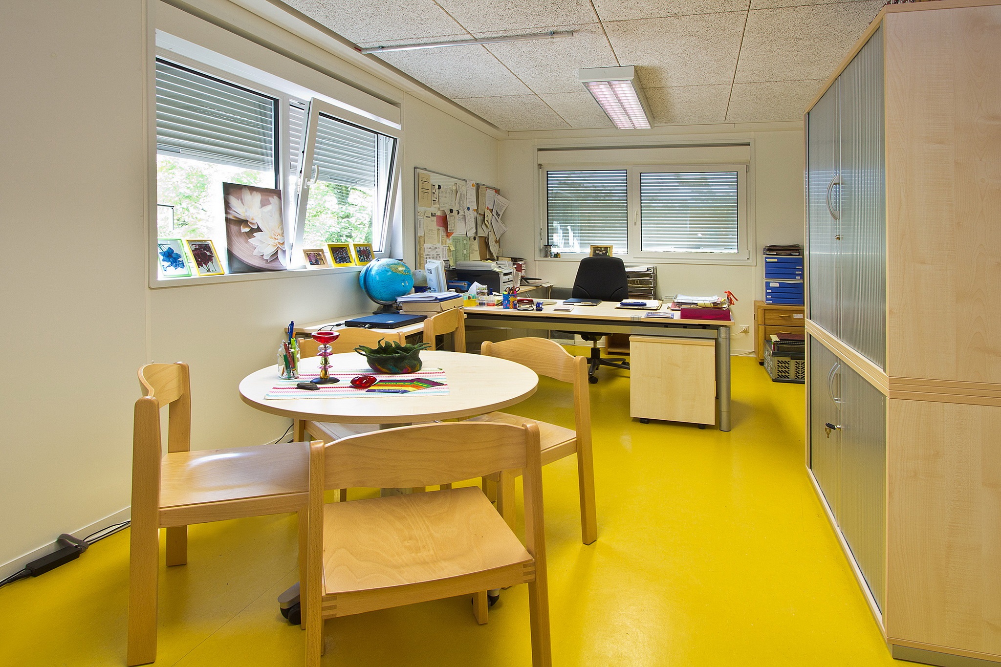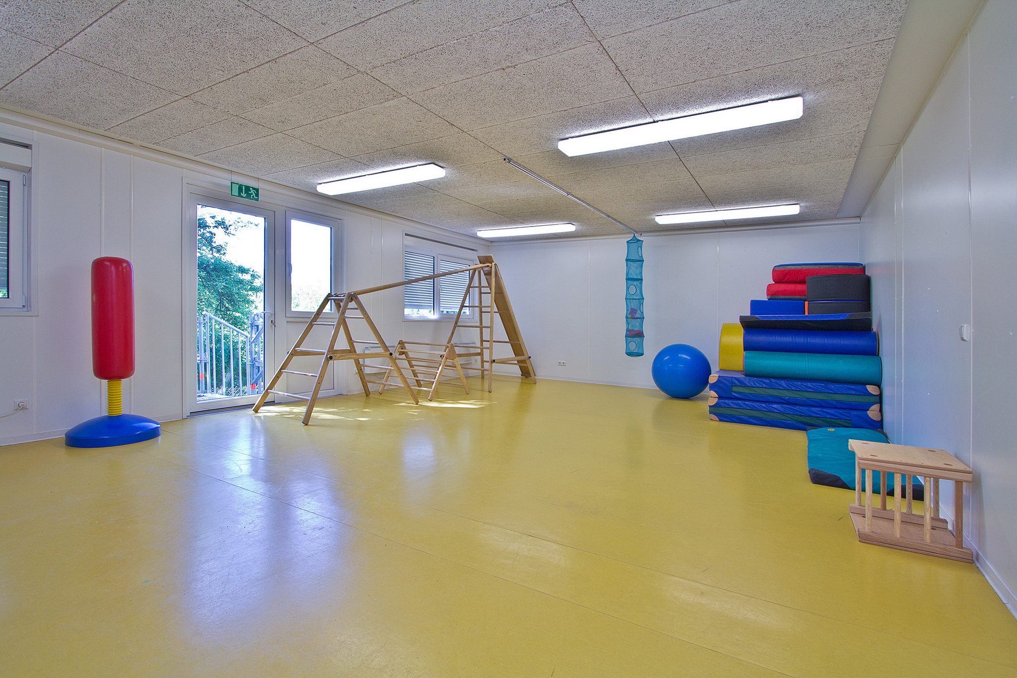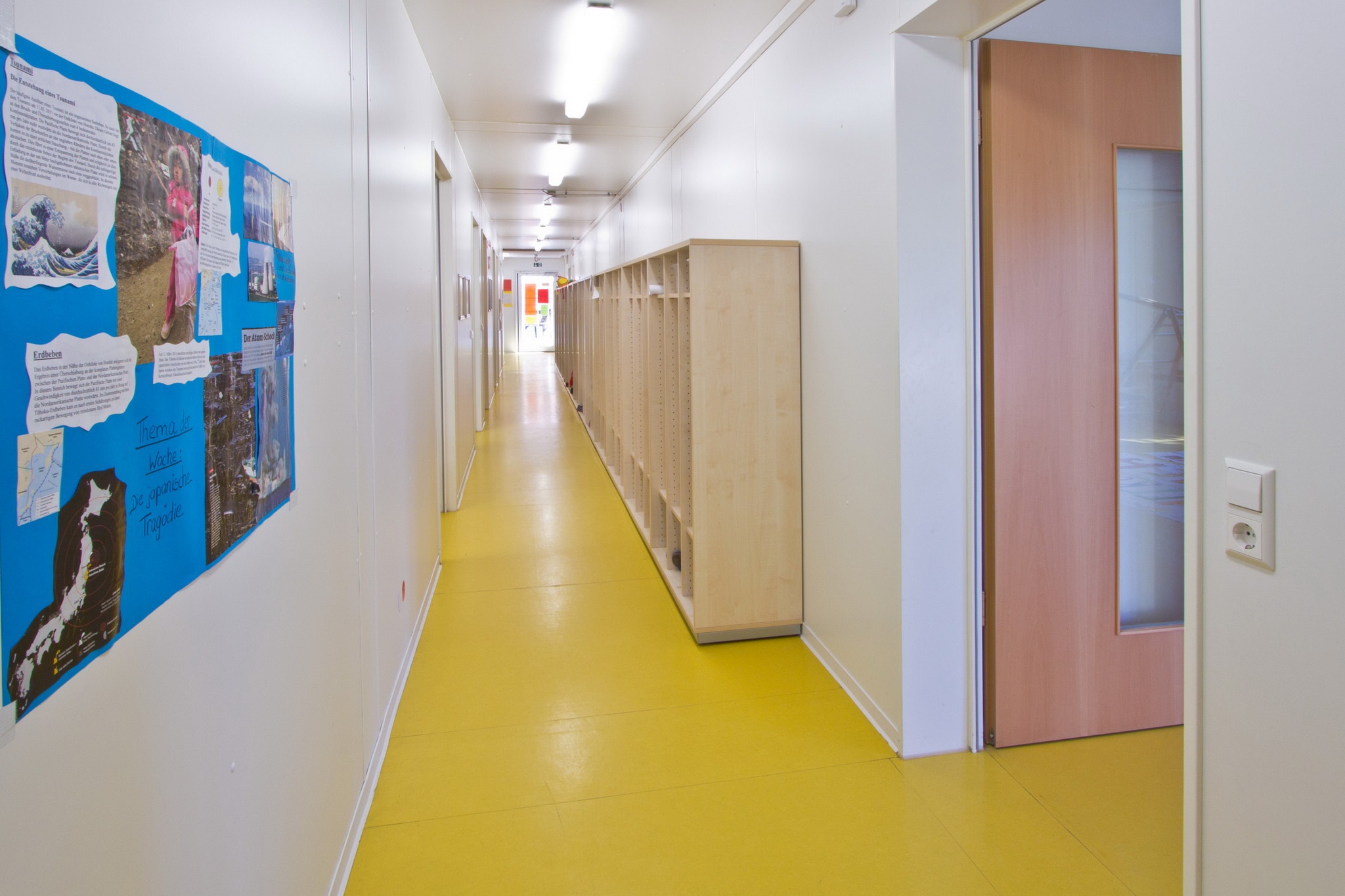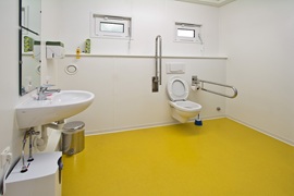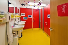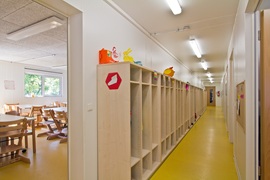 Sanitäranlagen für Mädchen und Jungen, Behinderten-Toilette, Verteilerküche, Elektroinstallation, Elektroheizung, Linoleum-Boden, Akustikdecke, Isolierglasfenster mit Kunststoffrahmen