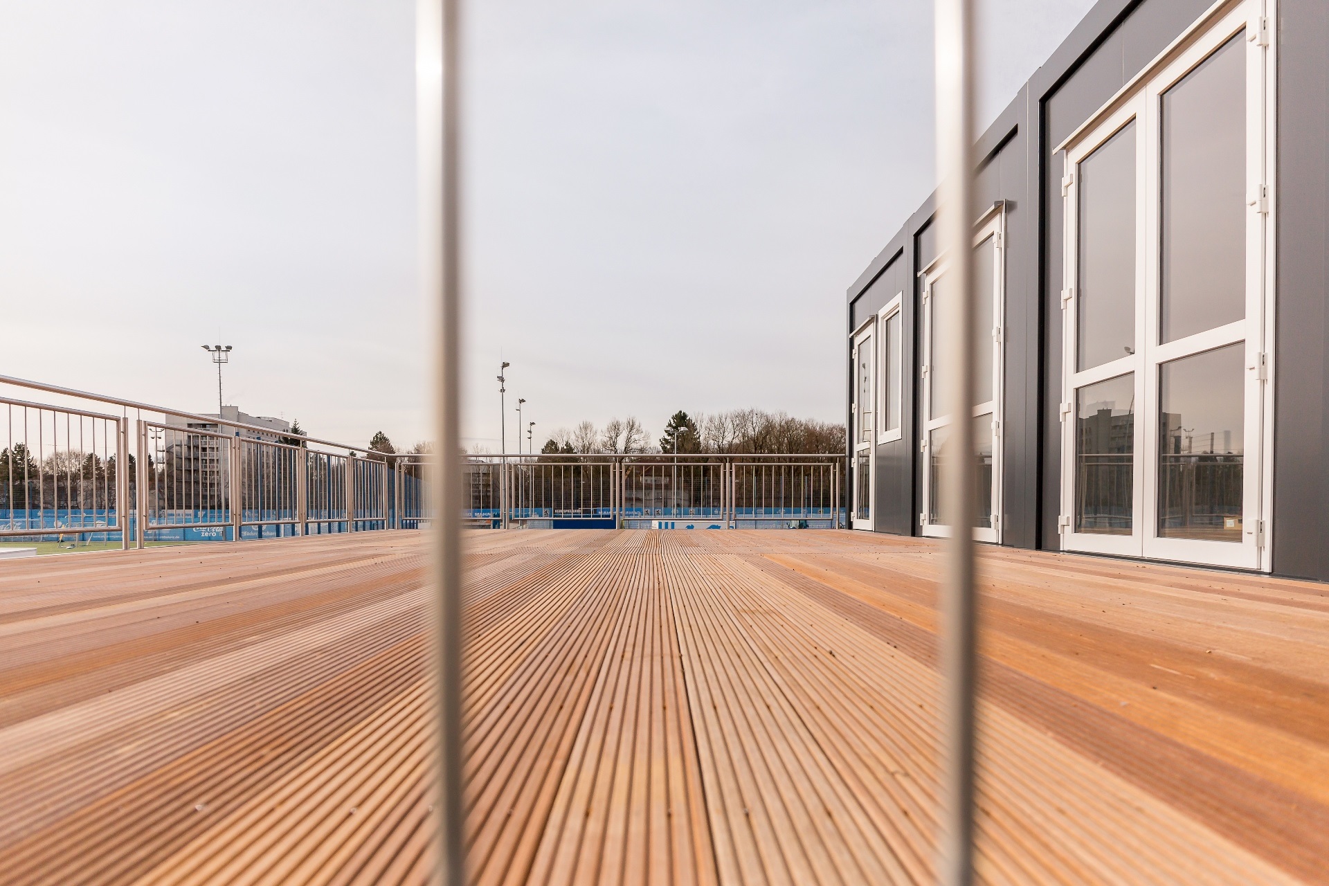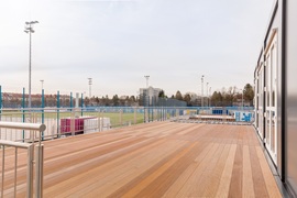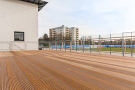 OG: Pressebereich mit Terrasse mit Holzboden und Edelstahlgeländer