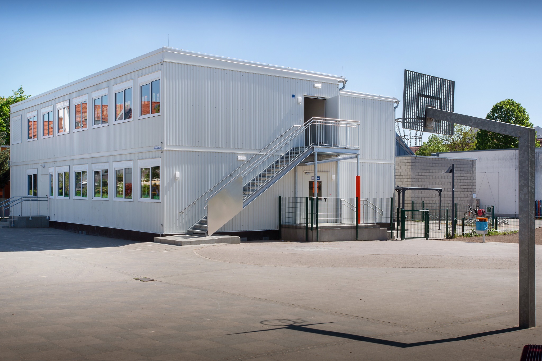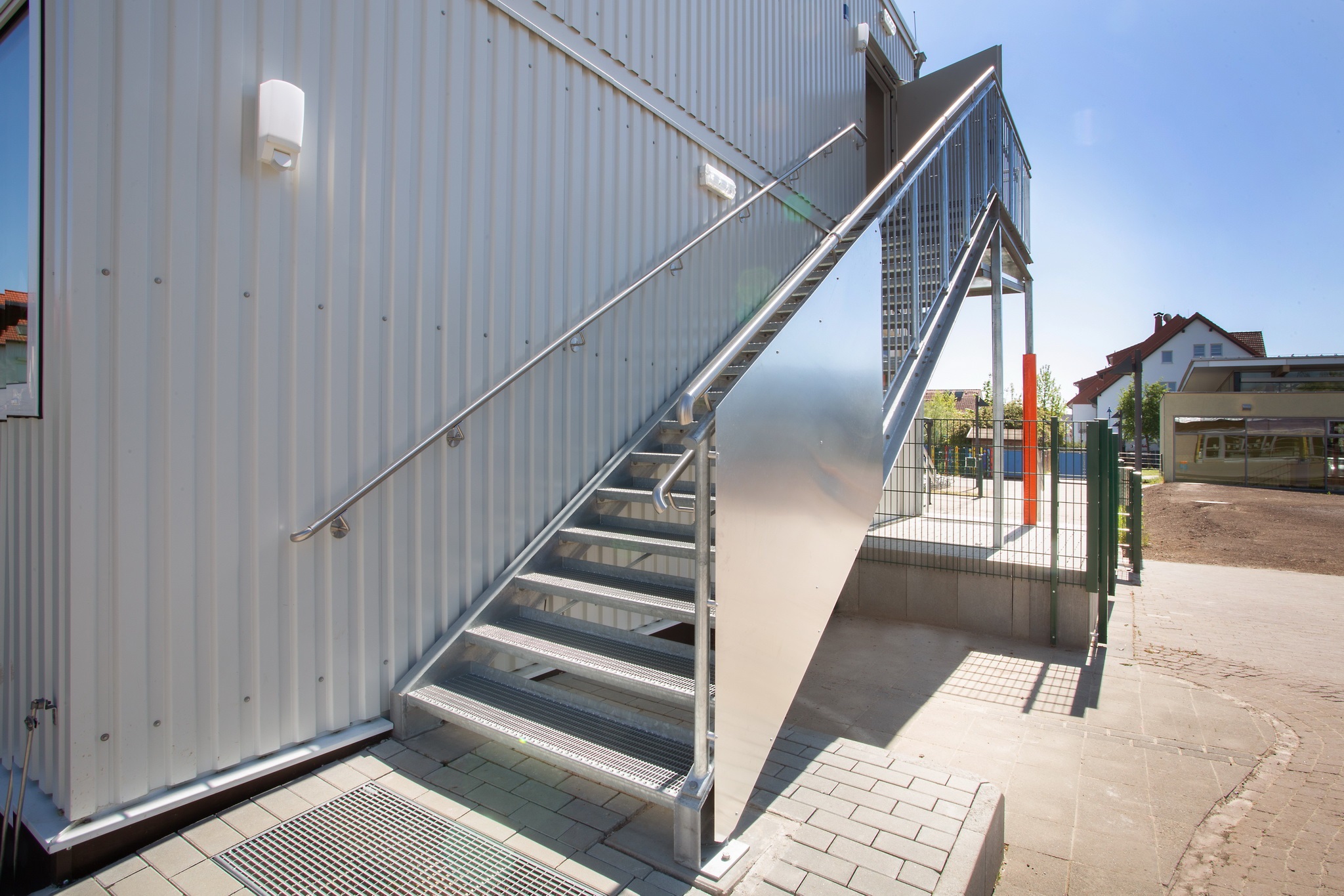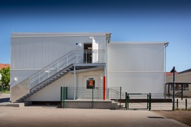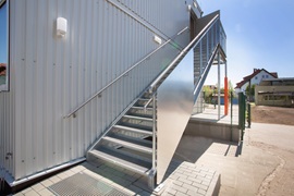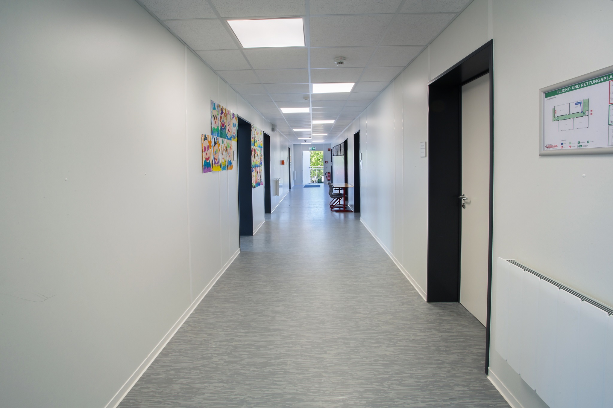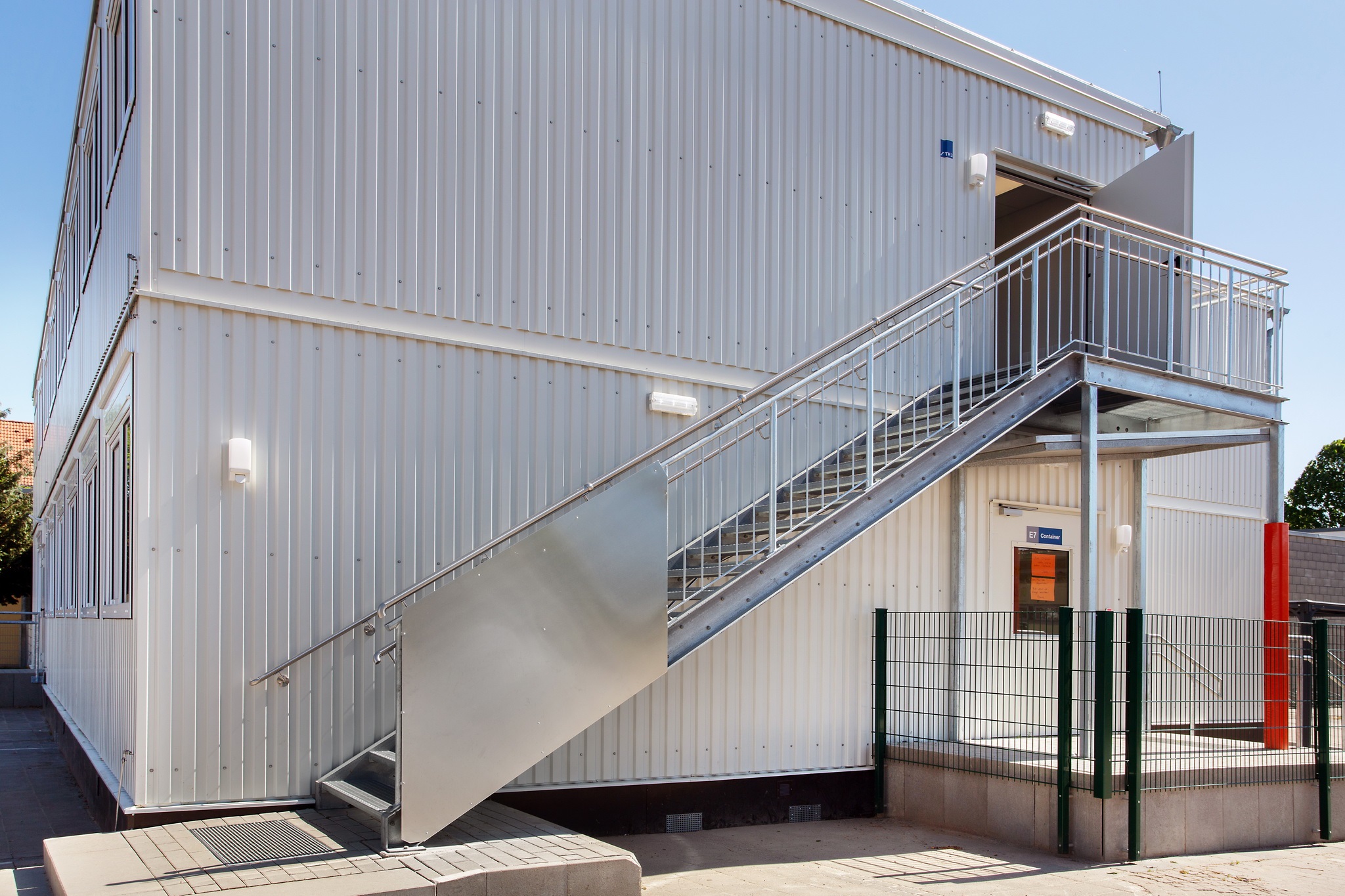 E-Installation, Niedertemperaturheizung, Rasterdeckenbeleuchtung, Linoleumboden, OWA-Decke, Rauchschutztüren, Brandmeldeanlage, Fluchtwegbeleuchtung, Außen- und Innenwände im Treppenhaus, sowie Geschoßdecke in F30, Außenaufgang, Innentreppenhaus. Pultdachausführung mit Entwässerung, Eingangs- und Einzelpodeste.