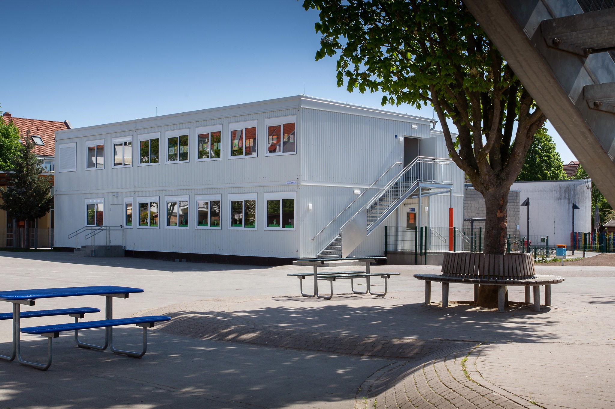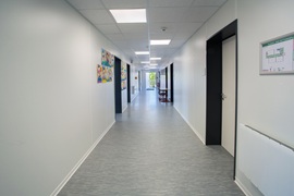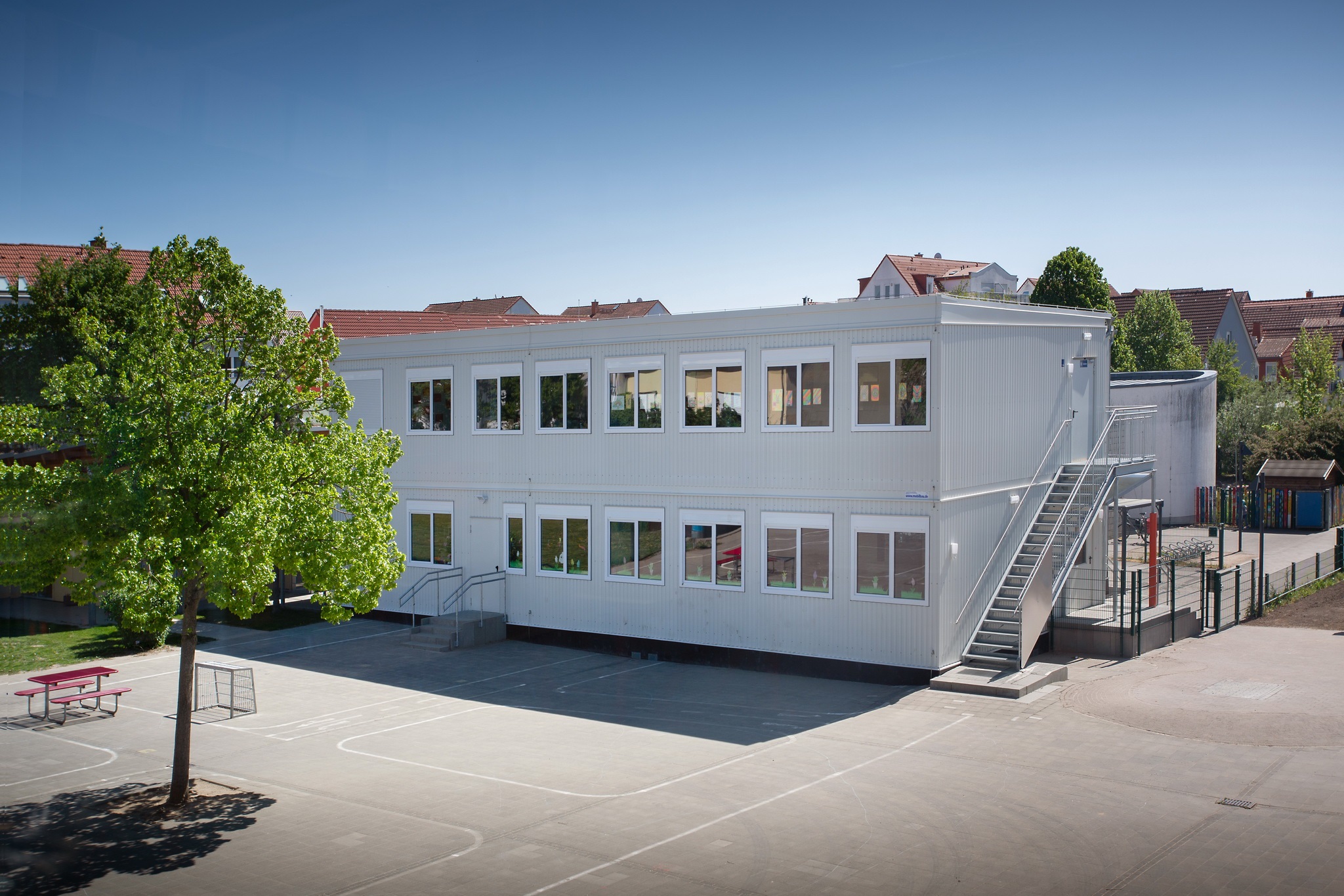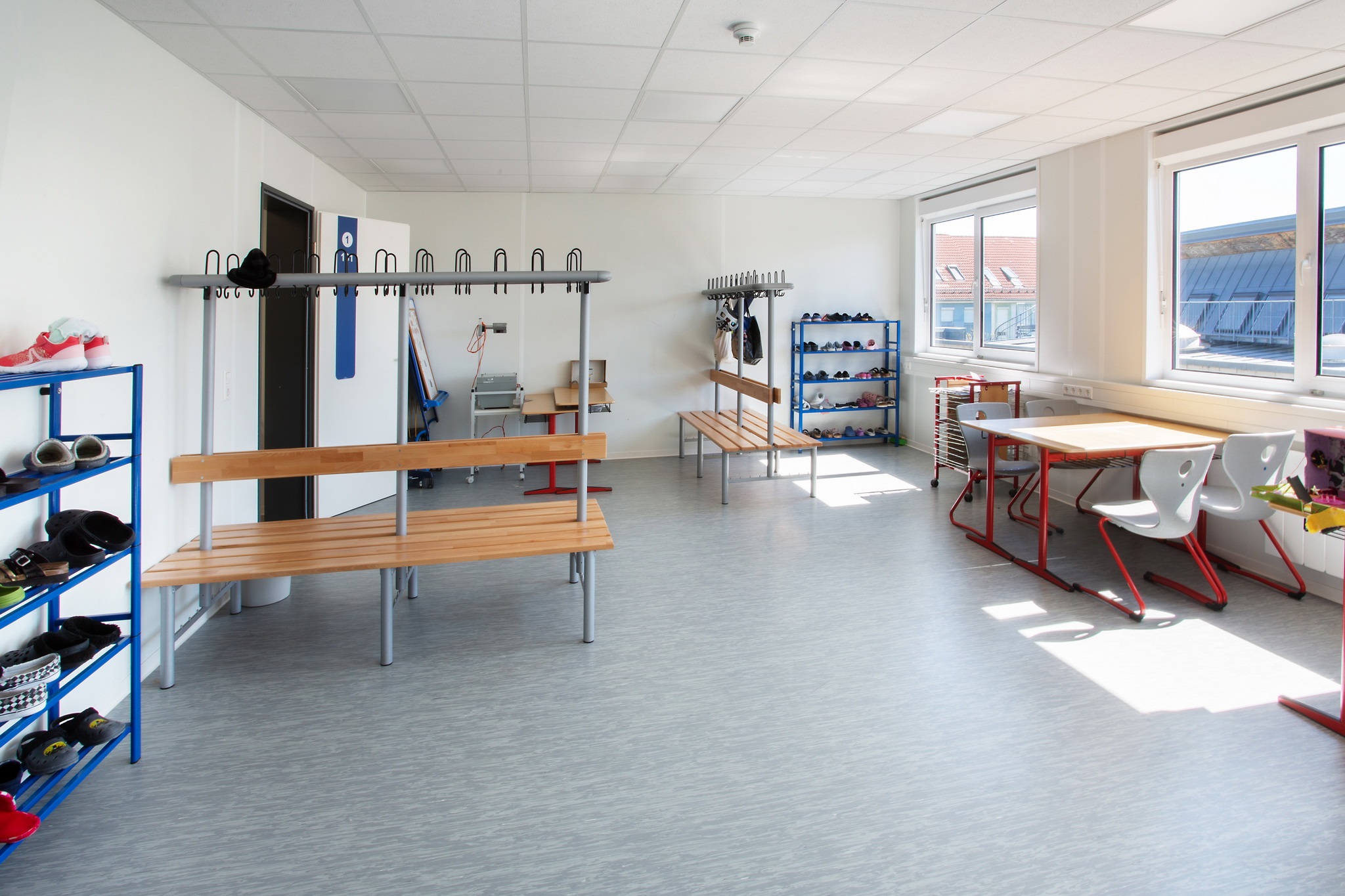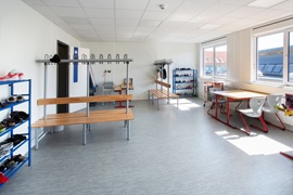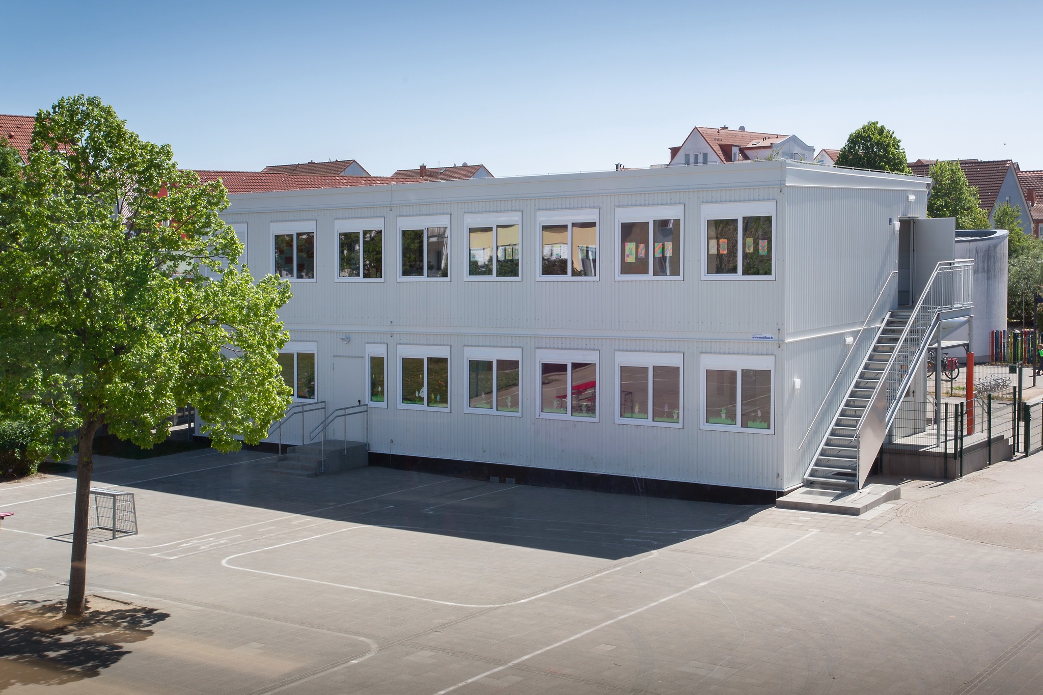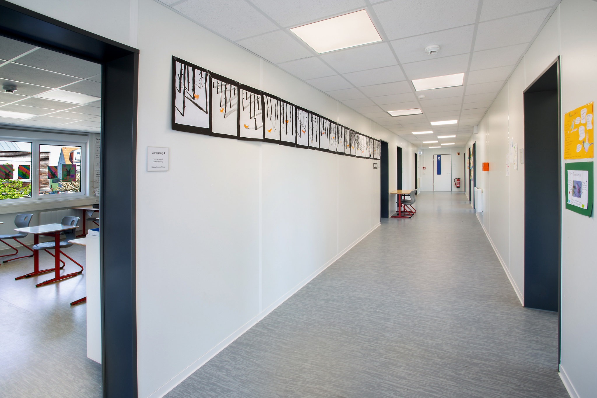 E-Installation, Niedertemperaturheizung, Rasterdeckenbeleuchtung, Linoleumboden, OWA-Decke, Rauchschutztüren, Brandmeldeanlage, Fluchtwegbeleuchtung, Außen- und Innenwände im Treppenhaus, sowie Geschoßdecke in F30, Außenaufgang, Innentreppenhaus. Pultdachausführung mit Entwässerung, Eingangs- und Einzelpodeste.