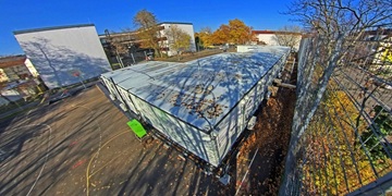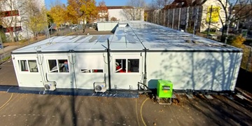 28 Module eingeschossig, in Winkelform (U), 6 Klassenräume, 1 Lager- und 1 Technikraum sowie Vordach-Container