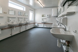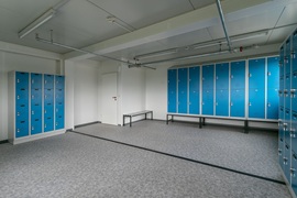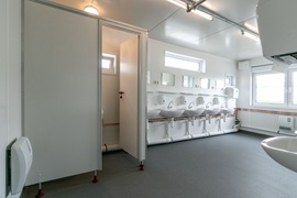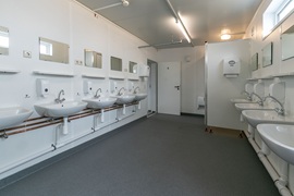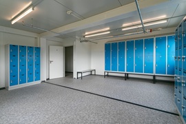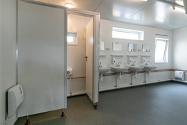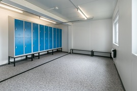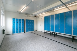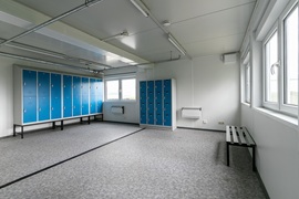 Sozialgebäude mit Duschen, Umkleiden, WC und Aufenthaltsräumen