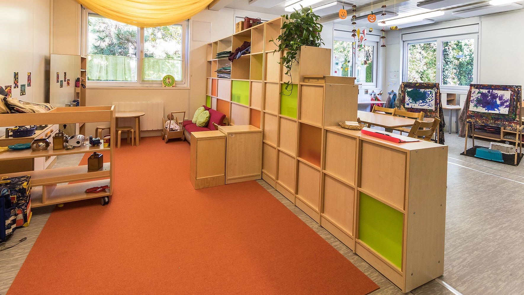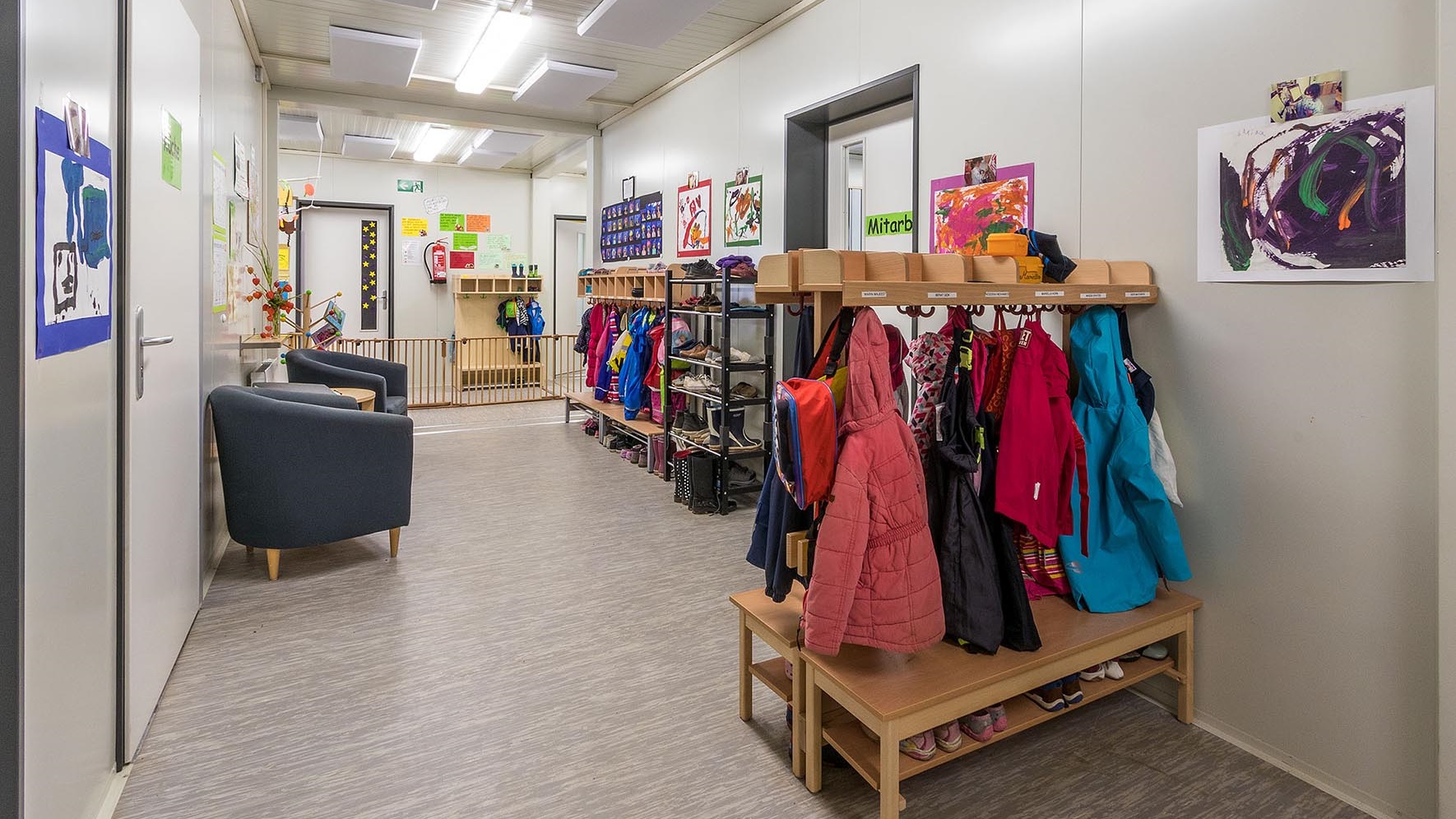 Anlage 1: Spiel- und Schlafräume, WC-Anlage mit Bambini WC, behinderten WC, Hauswirtschaftsraum, Büro, Sozialräume, Kücheneinrichtung für Tagesessensausgabe.