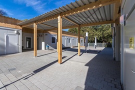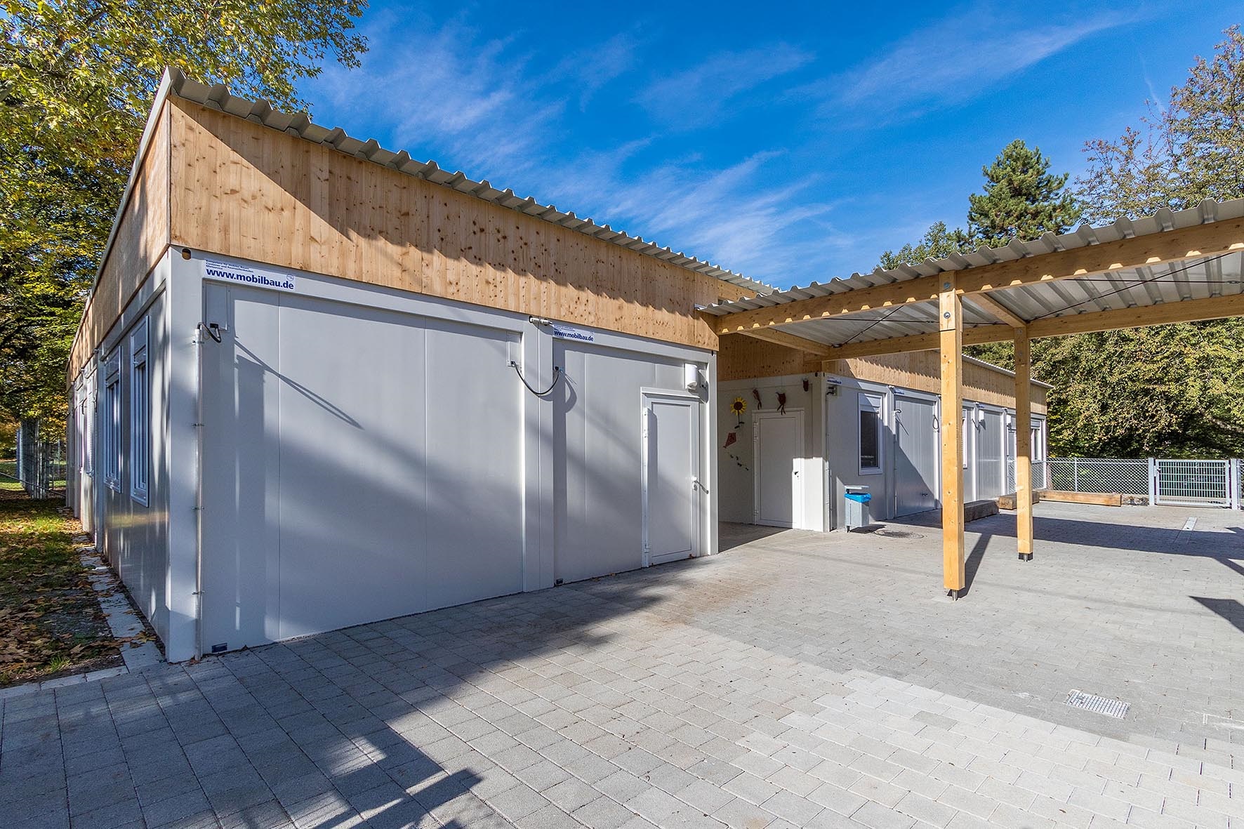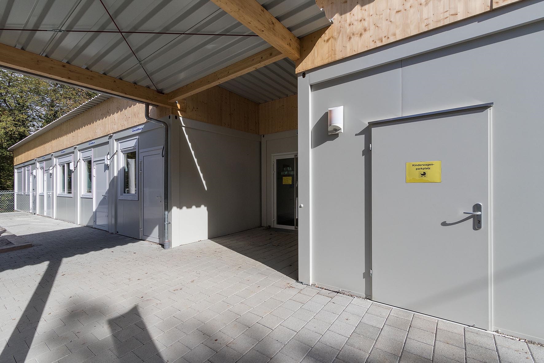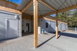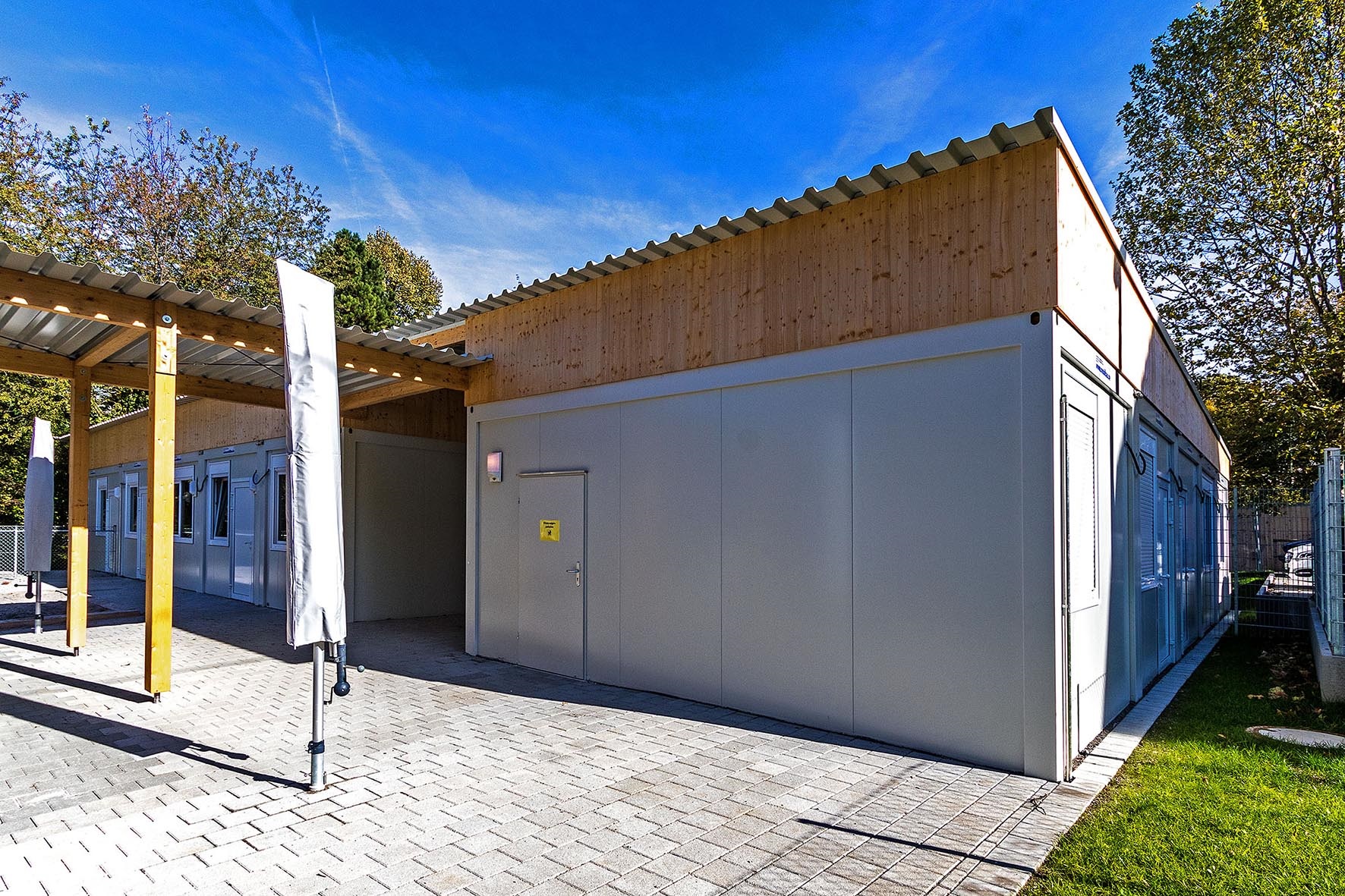 Elektro Heizung Kaltdachkonstruktion mit Leimbinder und Trapezdach inkl. Entwässerungsrinnen und Fallrohre. Dachkonstruktion mit Leimbindern und Trapezdach, Raumakustikplatten, Einbauküche mit 2 Konvektomaten und einer Industriespülküche. Sämtliche Türen und Fenster mit VSG Glas. Schallschutz-Vorsatzschale mit 47 db und Schallschutz Innentüren mit 32 und 37 db. Funkvernetzte Rauchmelder. Außenbeleuchtung. Die Gebäude sind mit einem überdachten Weg miteinander verbunden.