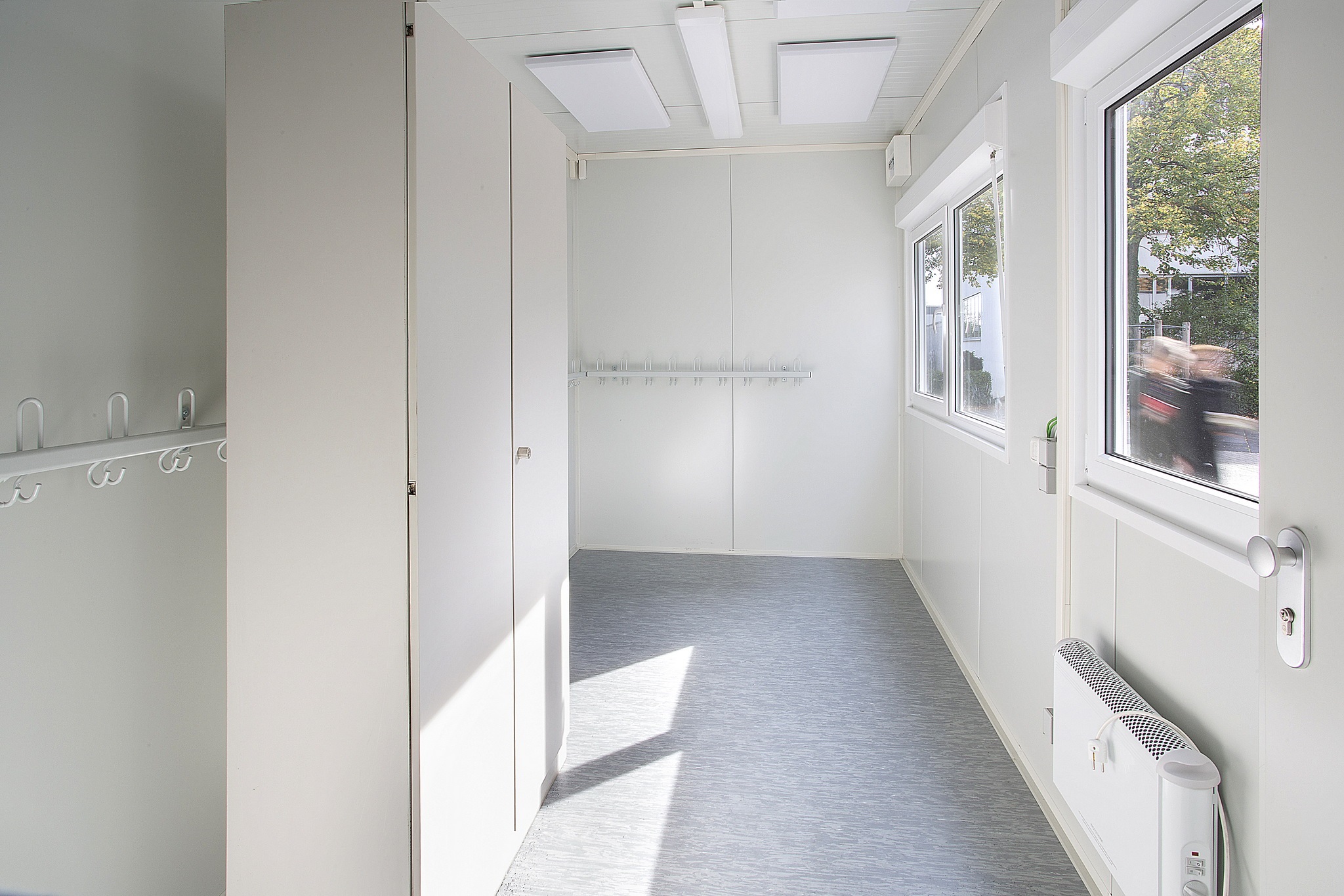 E-Heizung, Blitzschutz mit Tiefenerder, E-Installation mit Beleuchtung, EDV-Netz-Vorbereitung, Brandmeldeanlage, Eingang mit Gitterrost-Podesten und behindertengerechter Rampe, Wandgarderoben für 2 x 36 Schüler, 2 Whiteboard-Schultafeln, Feuerlöscher, Schalldämmplatten für Deckenunterschicht